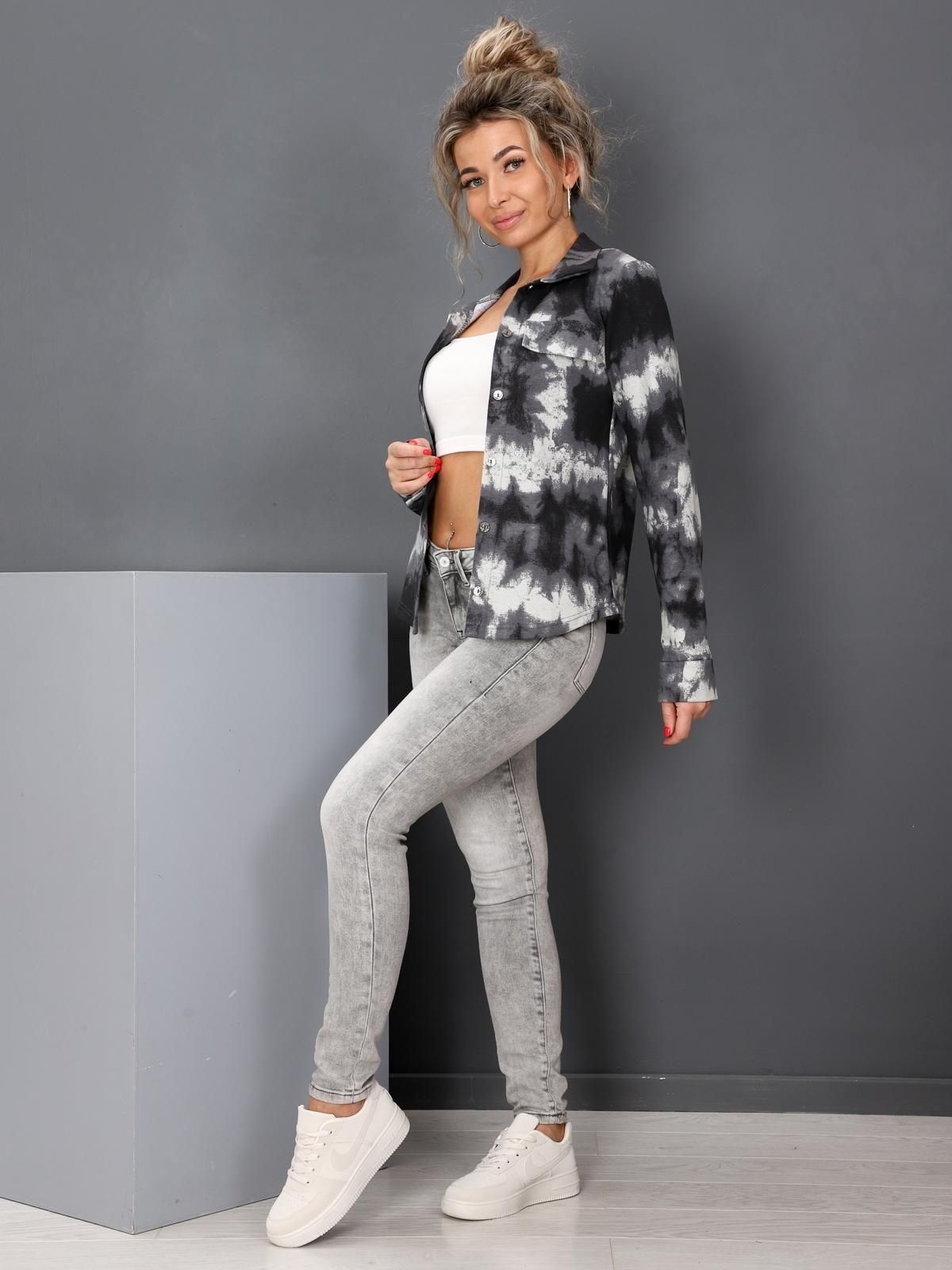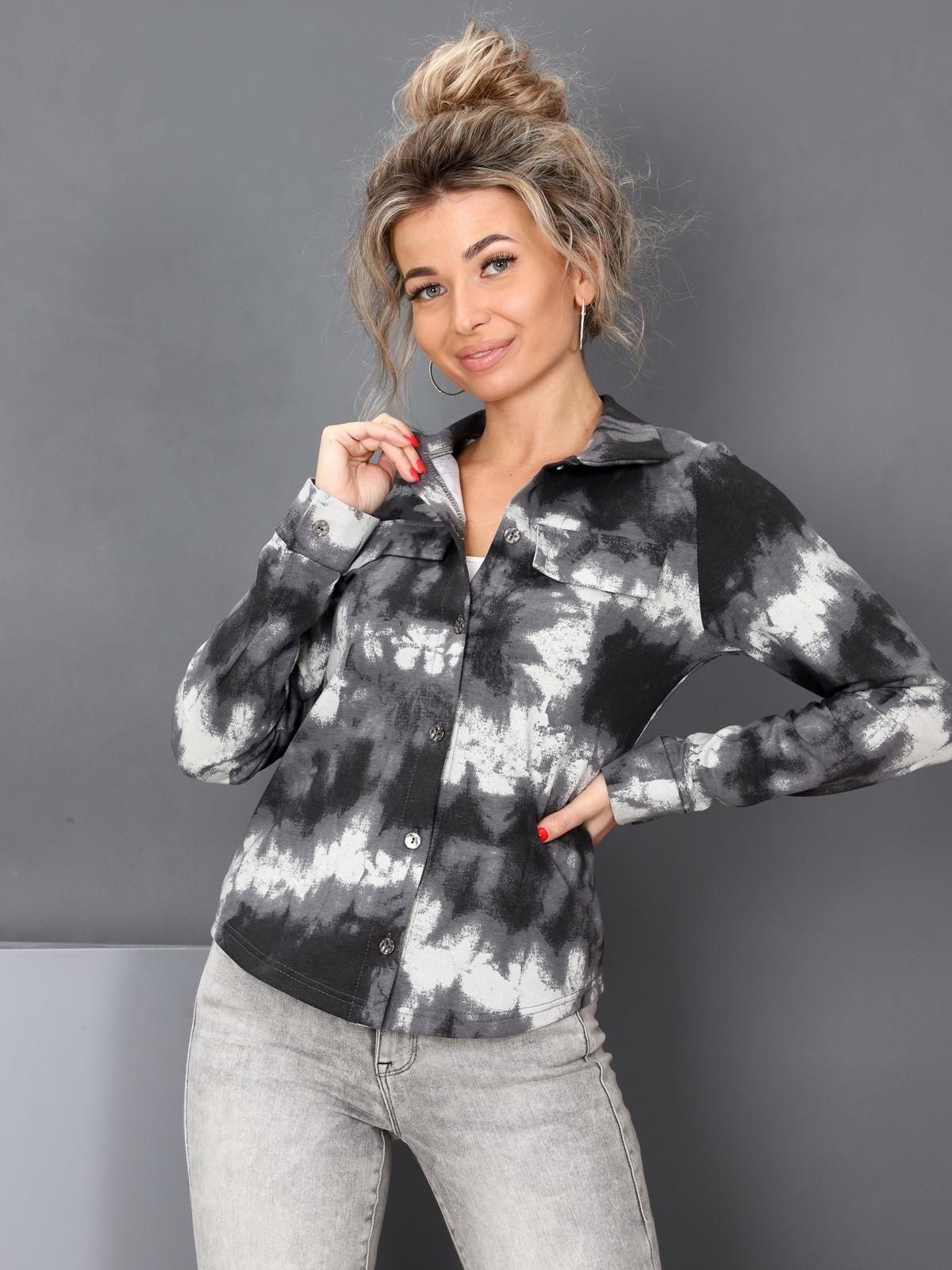 Жакет полуприлегающего силуэта, рукава втачные на манжетах с застежкой, на передних частях рубашки клапана (имитация кармана), воротник отложной, низ рубашки разноуровневый, застежка - пуговицы.