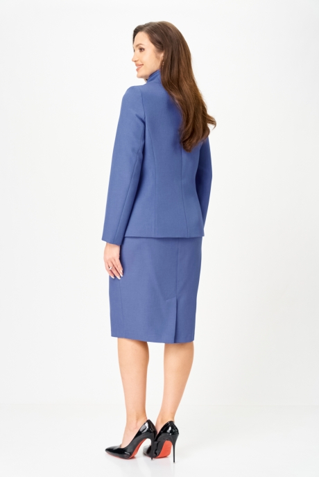 Комплект состоит из жакета и юбки. Жакет полуприлегающего силуэта на подкладке. По переду отрезные бочки, функциональные прорезные карманы с клапаном и асимметричный декоративный элемент в виде трёх мягких складок выходящих из подреза по талии по правой стороне переда, переходящий в двойной воротник-стойку по левой стороне переда. Спинка со средним швом и рельефами из проймы. Рукав длинный, втачной, двухшовный. Юбка на подкладке, со шлицей, зауженная к низу, с притачным поясом. В размерах 50-54 для комфорта в пояс по бокам вставлена резинка. Застежка в юбке на потайную тесьму-молнию в среднем шве заднего полотнища. Данная модель станет чудесным дополнением в Вашем гардеробе, выступая интересным офисным костюмом или, выполняя функцию сдержанного варианта для торжественных мероприятий.