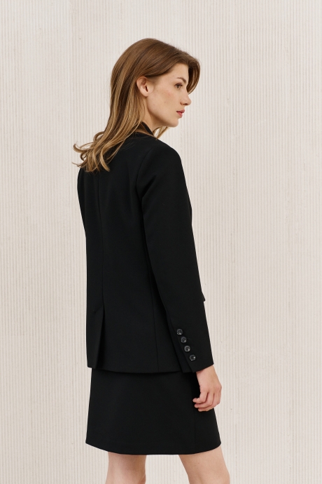 Жакет полуприлегающего силуэта на подкладке. Перед с декоративными вытачками, отрезным бочком и прорезными функциональными карманами с клапаном. Спинка со средним швом, в среднем шве щлица. Воротник пиджачного типа. Застежка двухбортная застегивающаяся на 4 декоративных пуговицы. Рукав длинный втачной со шлицей и с 4-мя декоративными пуговицами.