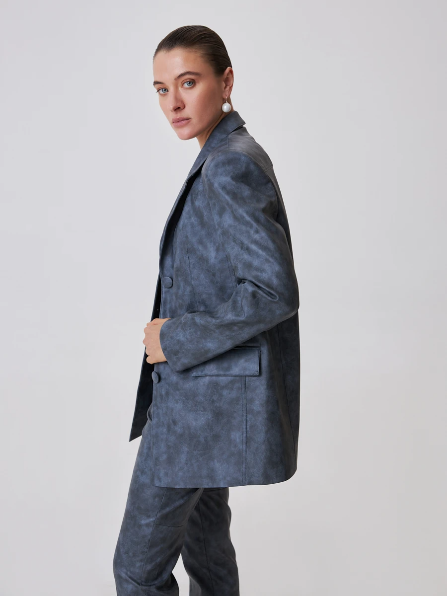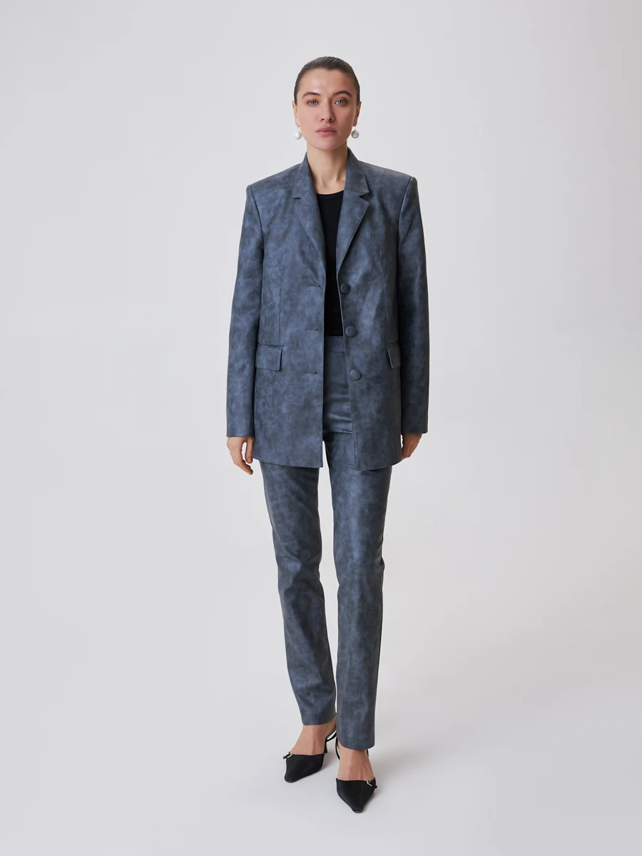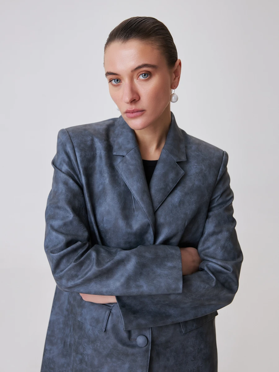 Строгий однобортный жакет из экокожи станет запоминающимся акцентом любого образа. Модель имеет темный серо-синий рисунок, напоминающий густой туман. Спереди расположены декоративные карманы с прямоугольными клапанами. Данный жакет отлично сочетается с однотонными майками и футболками спокойных оттенков. А универсальный oversize крой позволяет составлять сложные многослойные луки.