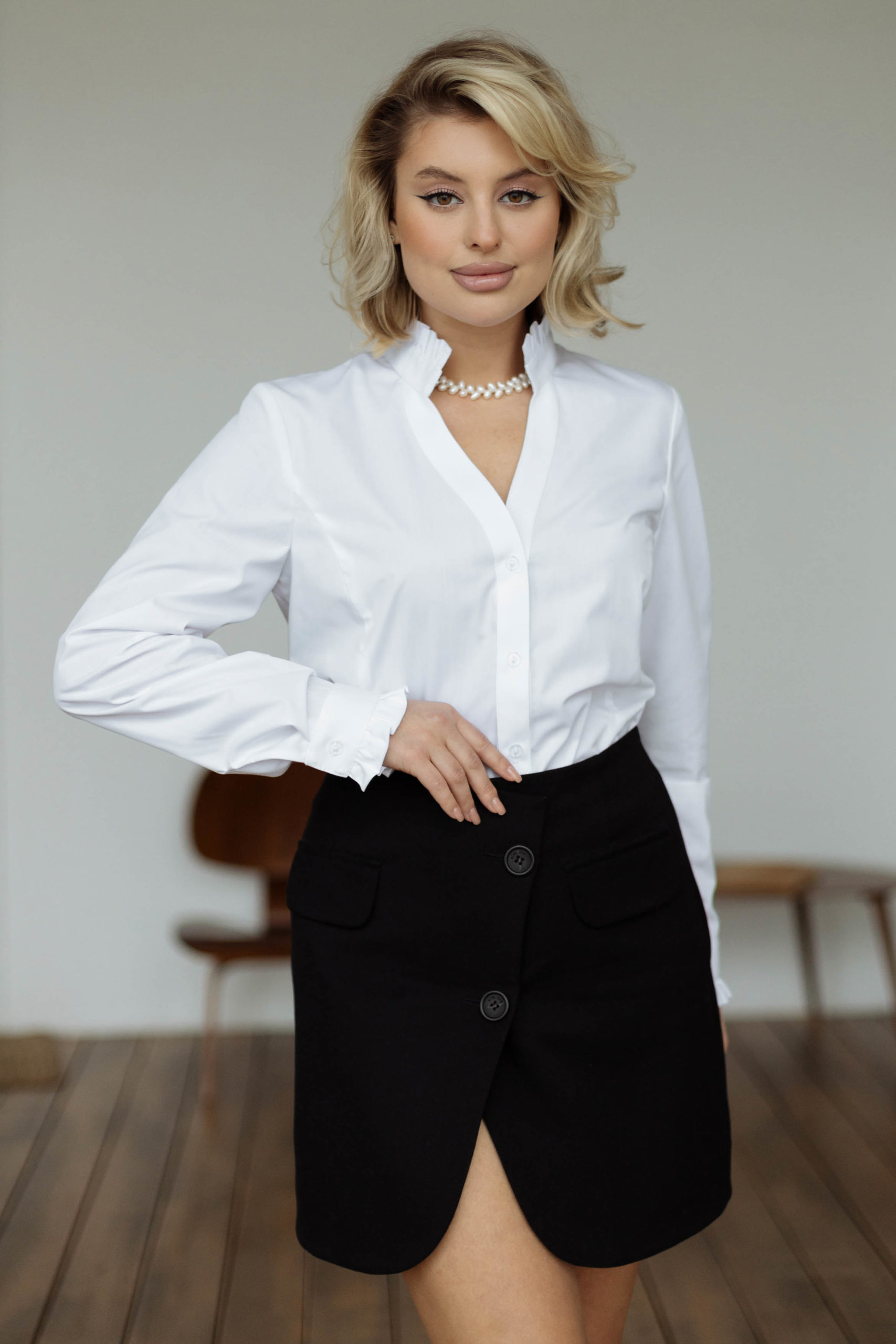 Очаровательная женственная блузка с изящными декоративными рюшами по воротнику-стойке и манжетам.