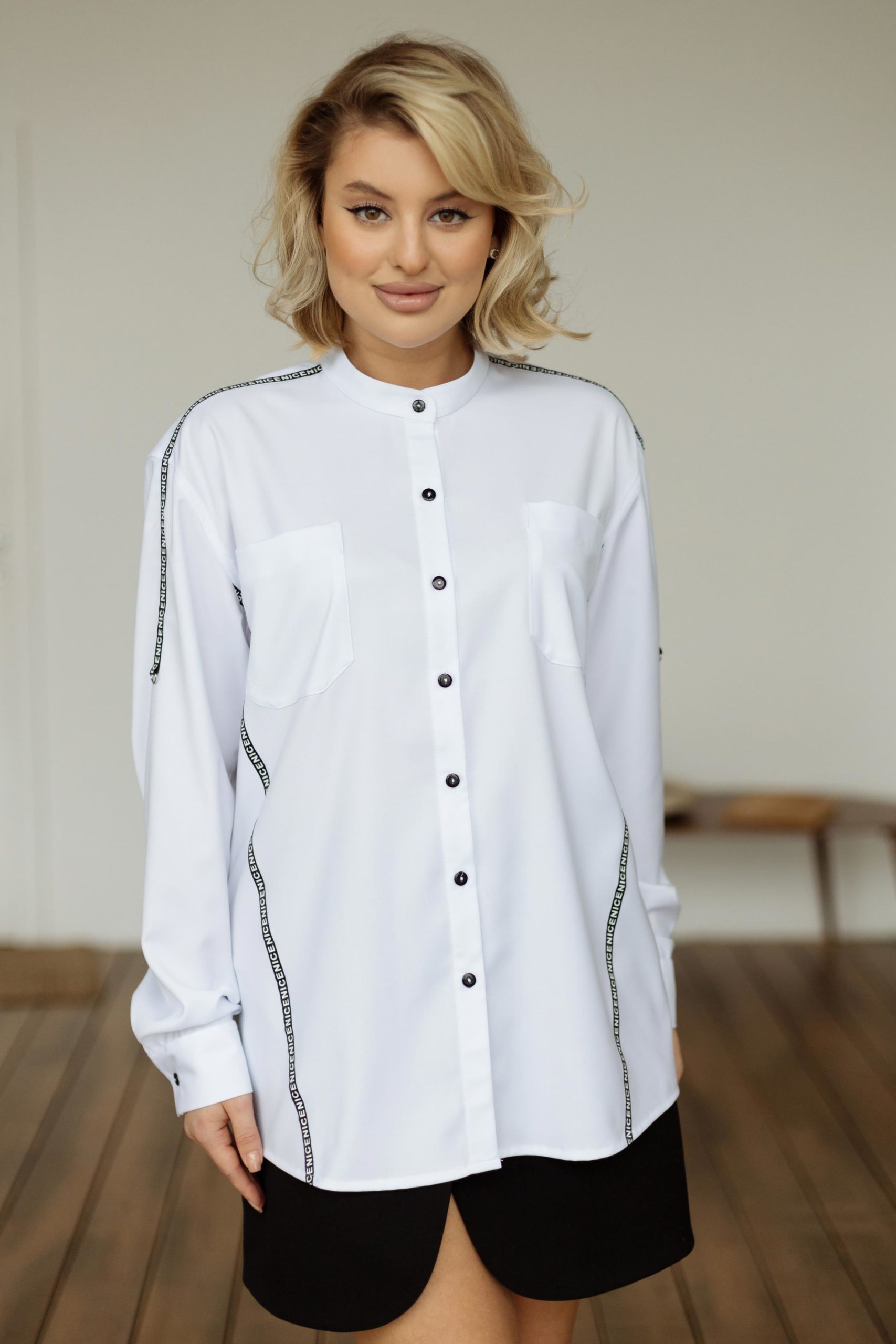 Свободная «мужская» рубашка из мягкой ткани с черной отделкой.