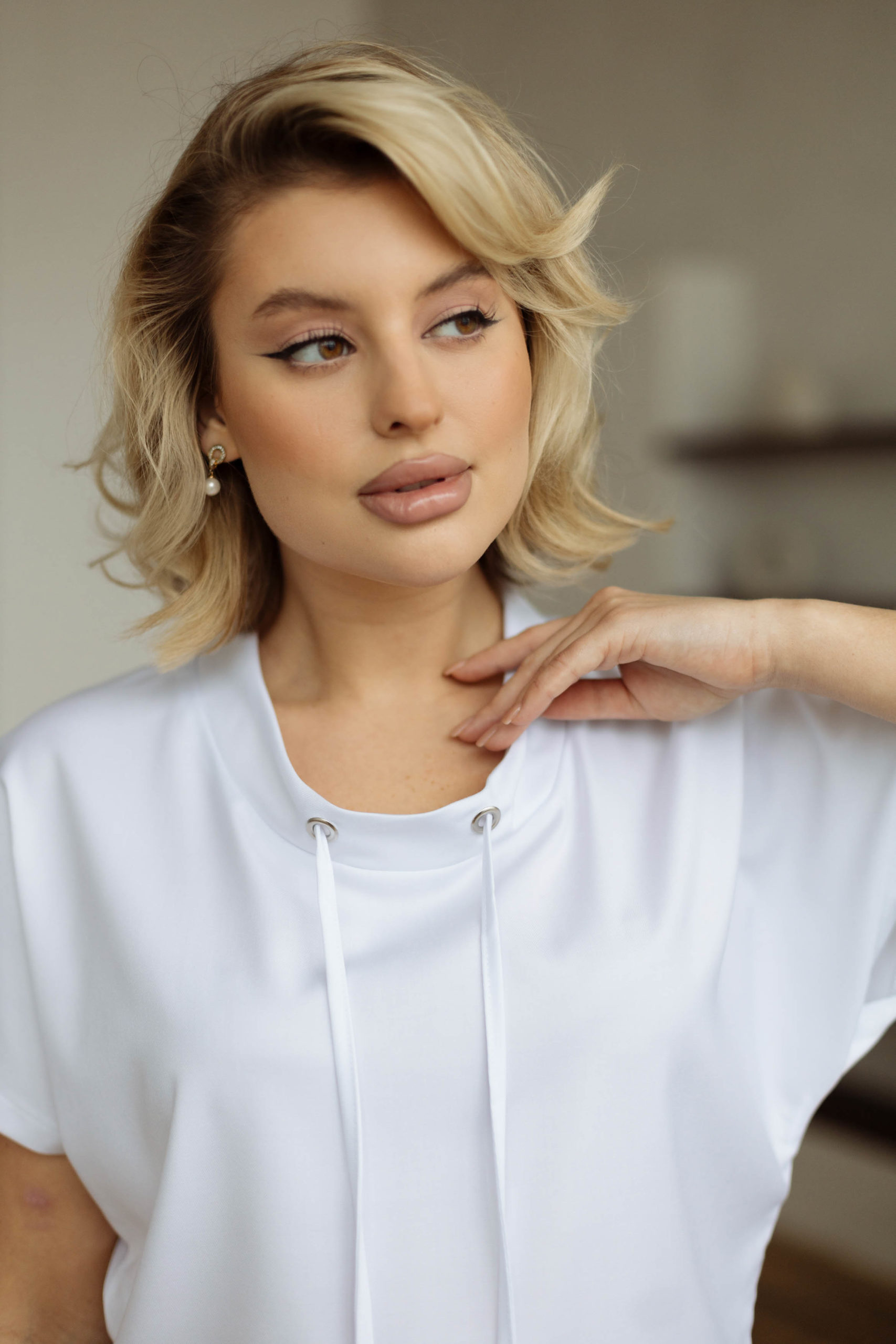 Лаконичная спортивная блузка со спущенной линией плеч.