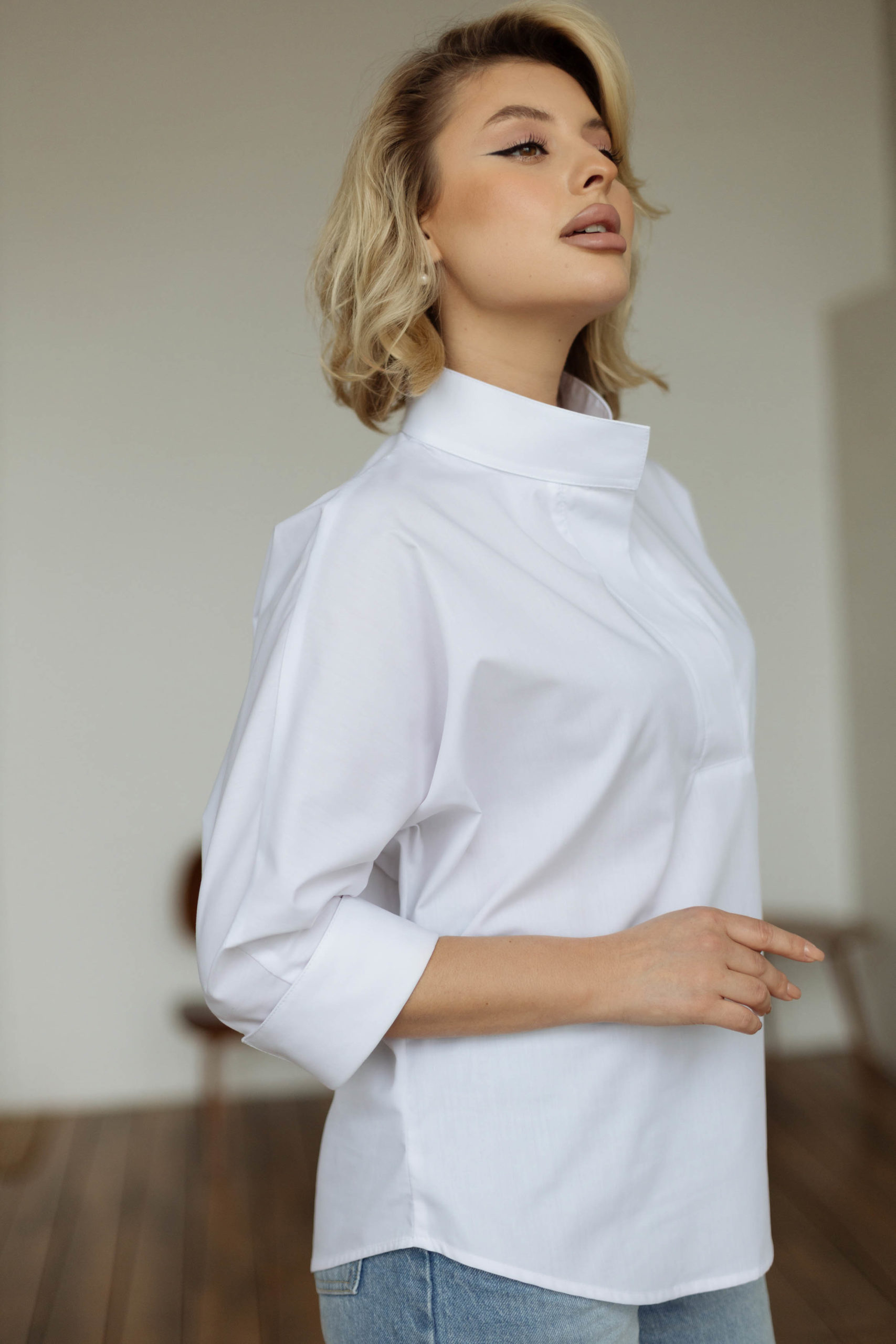 Высокий воротник- стойка, стильный вырез, в сочетании с цельнокроеным рукавом создают неповторимый свободный образ.