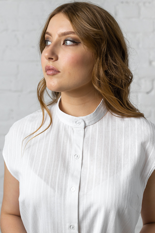 Полуприлегающая блузка со спущенным плечом и аккуратной стойкой.