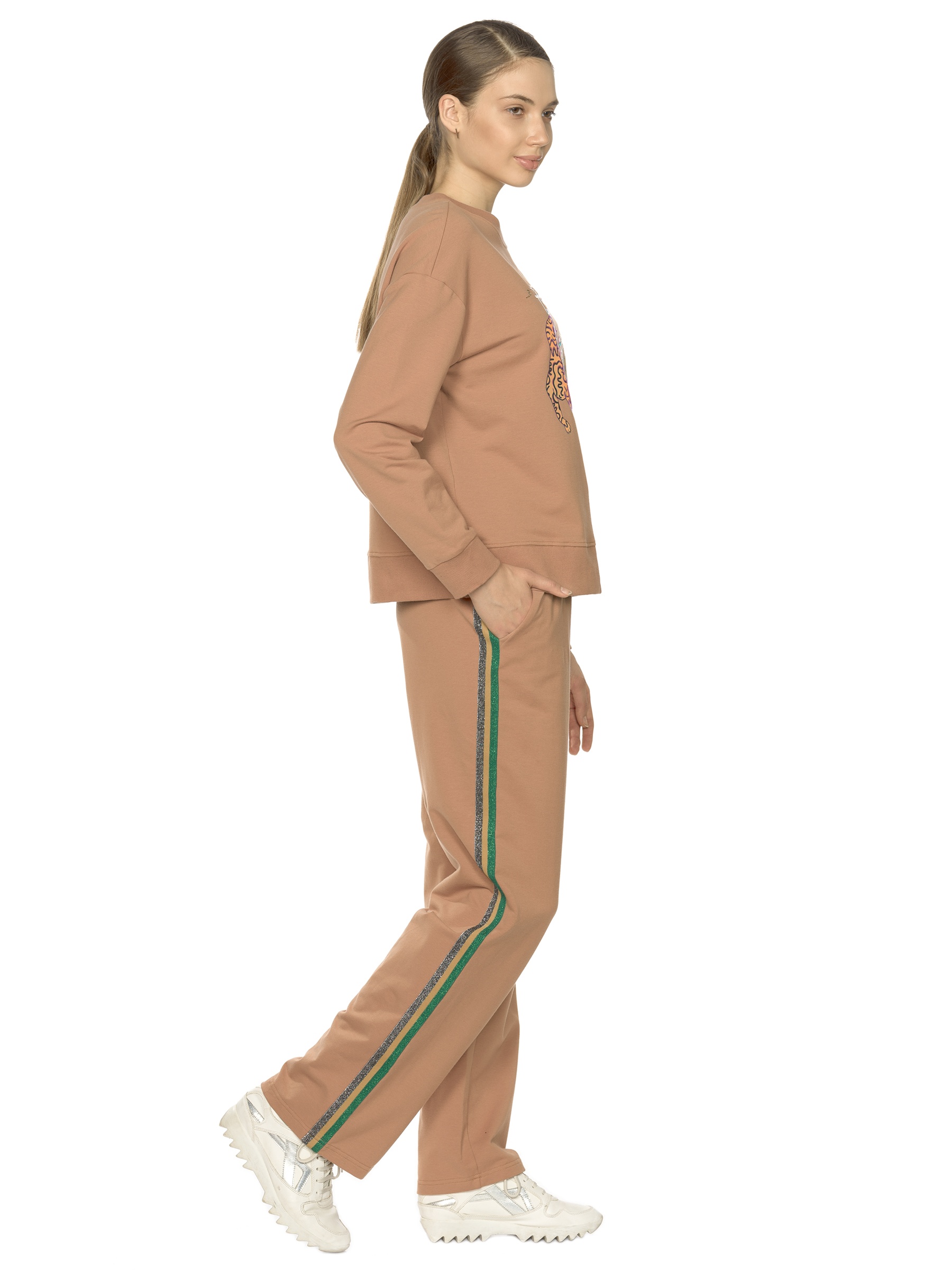 Состав: верх: 96%хлопок 4%эластан, низ: 96%хлопок 4%эластанОписание: Комплект женский свитшот и брюки. Свободный расслабленный объем. Укорочённый свитшот со стильными широкими манжетами из рибаны. Суперстойкий центральный моно принт с добавлением золота и цветных термостраз. Шрифтовой rubber принт выполнен золотым металликом. Перевод Что ж, никто не совершенен. Прямые свободные брюки с контрастными трикотажными лампасами с люрексом. Карманы в боковых швах.