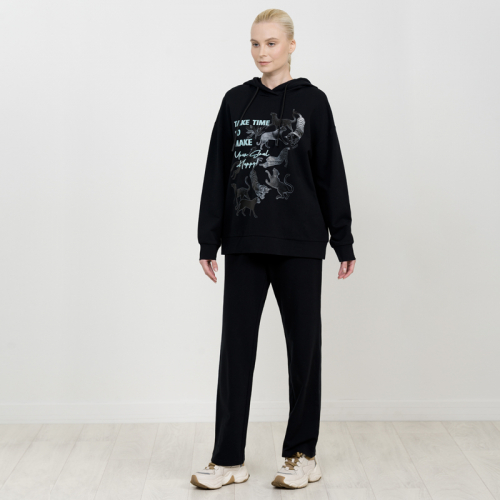 Состав: верх: 85%хлопок 12%полиэстер 3%эластан, низ: 85%хлопок 12%полиэстер 3%эластанОписание: Комплект женский толстовка и брюки из пластичного футера, среднего по толщине. Толстовка прямого кроя, свободного объёма, с сильно спущенной линией плеча. Кулиска со шнуром в высоком воротнике и по низу изделия. Принт в эклектичной стилистике, с добавлением золотого металлика и цветных термостраз. Шрифтовой принт выполнен теплым золотом. Перевод Что такое любовь? Любовь это когда ты не можешь уснуть, потому что реальность лучше снов. Брюки прямого кроя, на широкой резинке. Два боковых кармана.