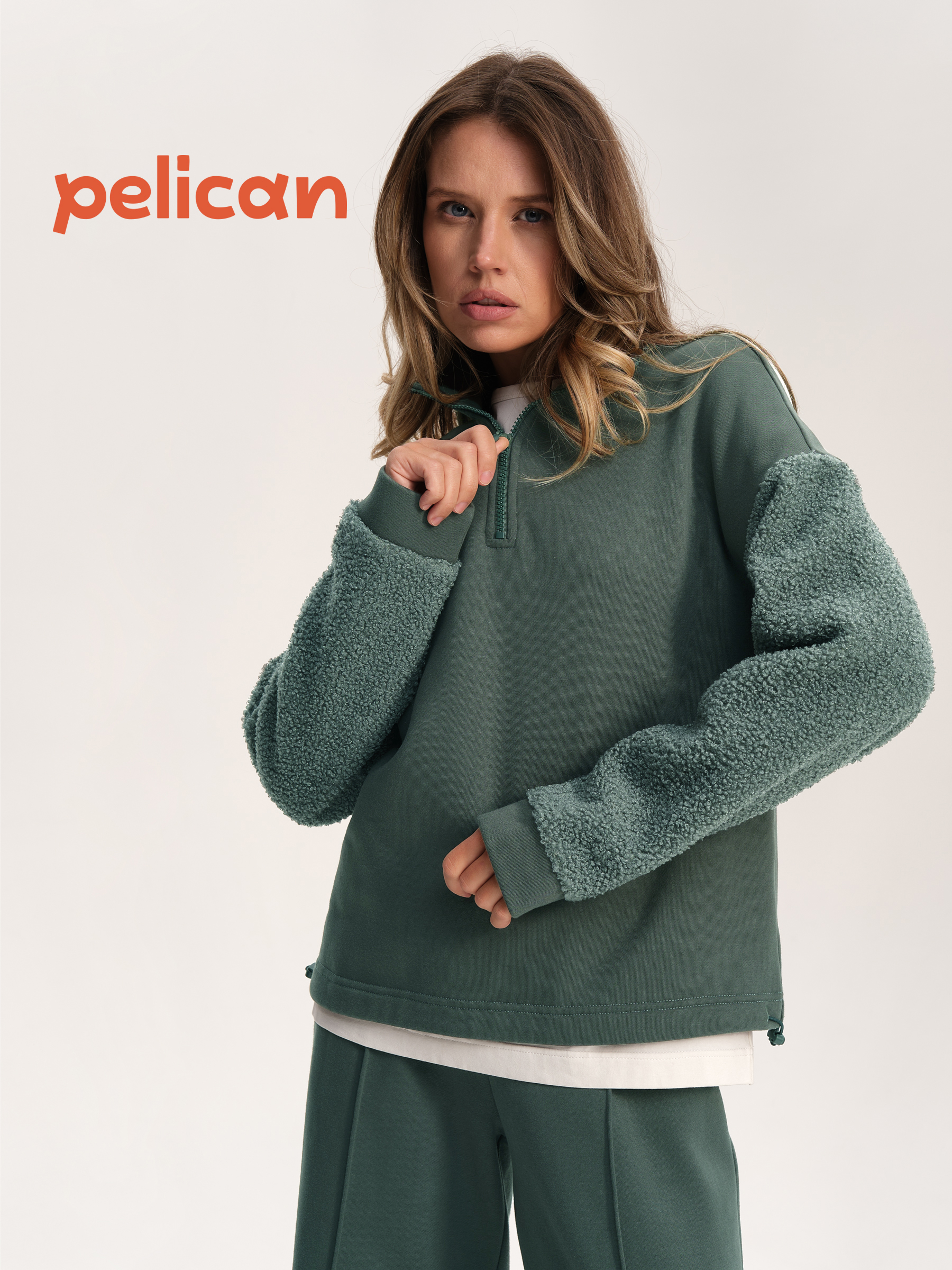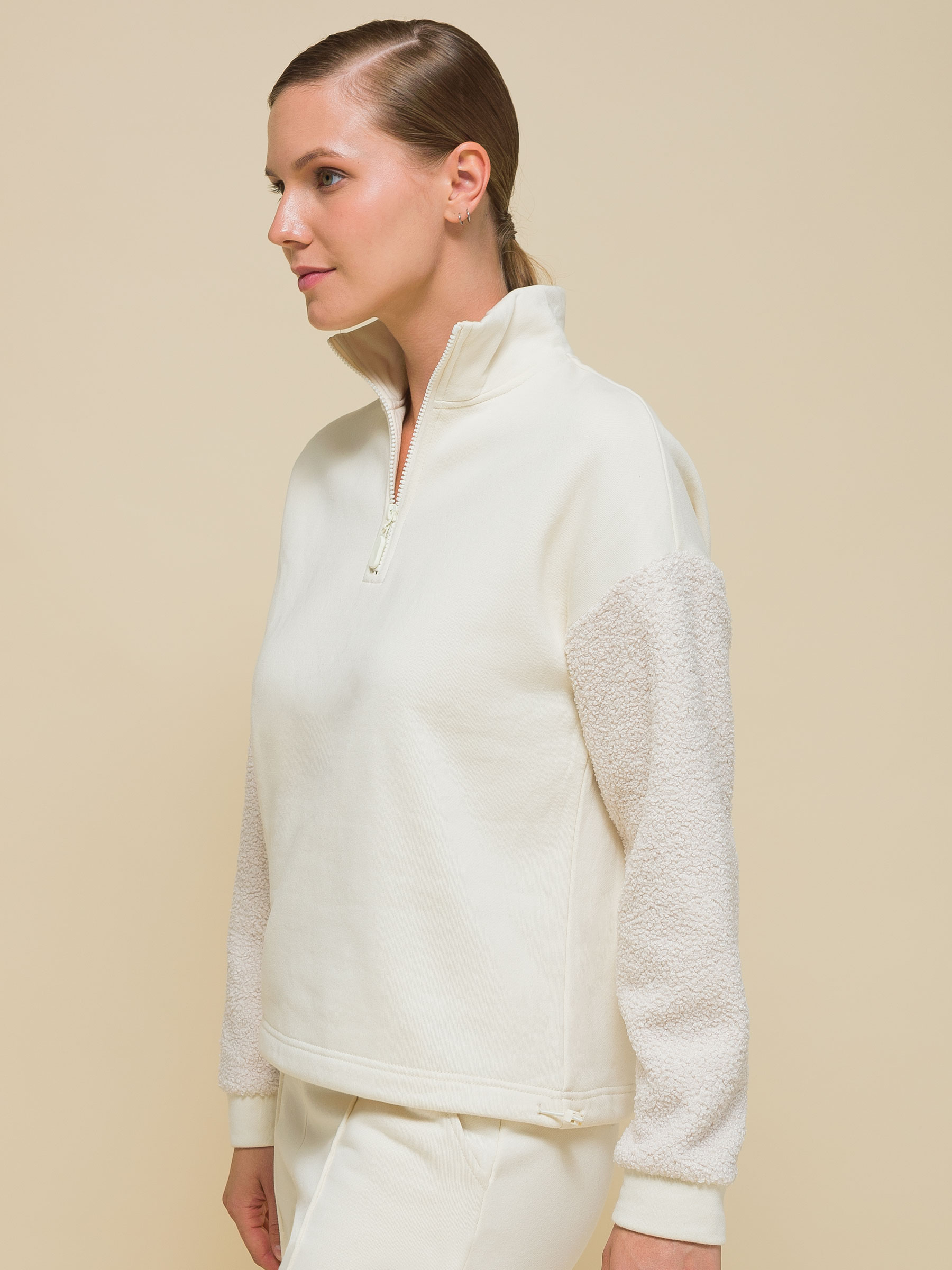 Состав: 60%хлопок 40%полиэстер, вставка: 100%полиэстерОписание: Стильный женский свитшот свободного силуэта со спущенным плечом. Толстовка без капюшона выполнена в комбинации двух материалов: гладкого футера и фактурного меха «барашек». Это актуальный модный тренд. Толстовка с воротником-стойкой. Он защитит от холода и ветра. Застёжка на короткую молнию — удобно и быстро застёгивать и расстёгивать. По низу удобная кулиска — можно регулировать объём и посадку. Свитшот однотонный, без принта. Изделие неприхотливо в уходе, его легко стирать, ткань быстро сохнет и не склонна к образованию катышков. В составе основной ткани (футкер с начесом) преобладает качественый хлопок — толстовка мягкая, отлично дышит. Рукава выполнены из мягкого и приятного на ощупь бербер-флиса (фактура «барашка»). Свитшот представлен в двух универсальных цветах: чёрном и молочном. Его легко сочетать с различными моделями брюк. Размерная линейка: XS (42): S (44): M (46): L (48). Толстовка идеальна как для женщин, так и для девушек и девочек-подростков. Подходит и высоким, и невысоким девушкам. Оверсайз-свитшот — прекрасный выбор для повседневной носки и активного отдыха. Он тёплый, лёгкий и мягкий. Для круглогодичного применения: прохладным летом, осенью, зимой, весной и демисезон. Это модный и практичный подарок для сестры, подруги или дочки на любой праздник.