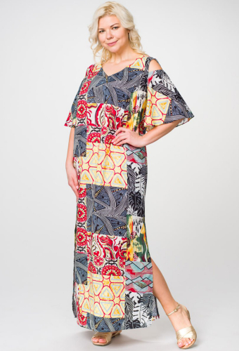 Платье женское полуприлегающего силуэта, длиной до середины икры.Спинка и перед с округлыми бейками из отделочной ткани по горловине, а по боковым швам снизу образуется шлицы с бейками из отделочной ткани. Рукав втачной с полосой по середине из отделочной ткани. Горловина переда V-образная с отрезной отделкой. Низ рукава и низ изделия с отделочной строчкой-3 см.