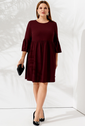 Платье женское полуприлегающего силуэта, длиной до середины икры.Спинка и перед с округлыми бейками из отделочной ткани по горловине, а по боковым швам снизу образуется шлицы с бейками из отделочной ткани. Рукав втачной с полосой по середине из отделочной ткани. Горловина переда V-образная с отрезной отделкой. Низ рукава и низ изделия с отделочной строчкой-3 см.