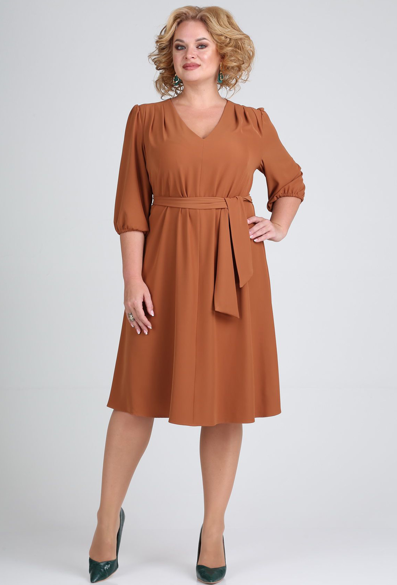 Платье женское свободного кроя расклешённое к низу со съёмным поясом. Спинка со средним швом. Перед с плевыми кокетками и мягкими складками. Рукав втачной одношовный собран на резинку по низу. Горловина V-образной формы.