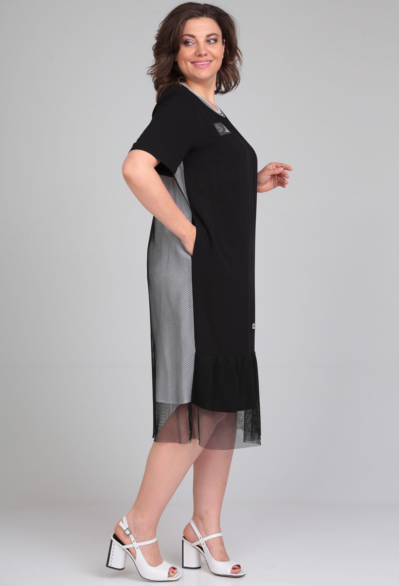 Платье полуприлегающего силуэта.По переду нагрудные вытачки,внизу-двухцветный волан с сеткой присборенный по шву притачивания.На спинке двойная кокетка.Рукав втачной с отворотом.Горловина обработана трикотажным довязом.