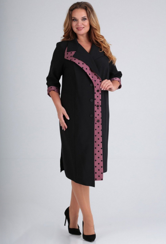 Платье женское полуприлегающего силуэта с двумя правыми полочками типа двухслойного эффекта, с застёжкой на петли и пуговицы. Перед с рельефами от плеча до низа. Внутренняя центральная часть переда выполнена из отделочной ткани. Рукав втачной одношовный с вытачкой по низу из отделочной ткани. Воротник отложной с лацканами. Отделочная строчка по низу и разрезам на 0,2 см от края. Длина по спинке 103 см. , длина рукава 47 см.