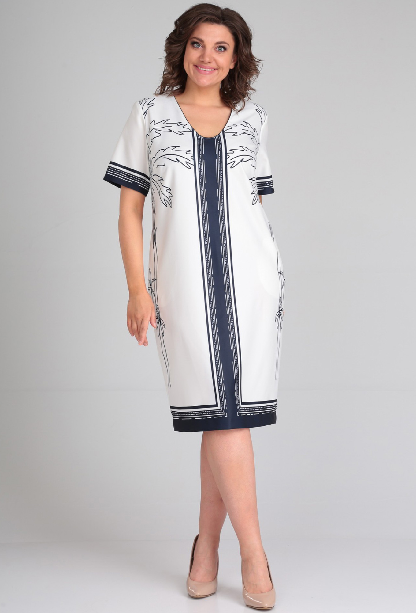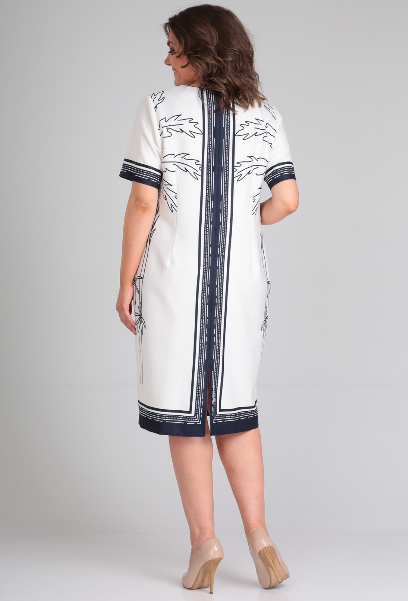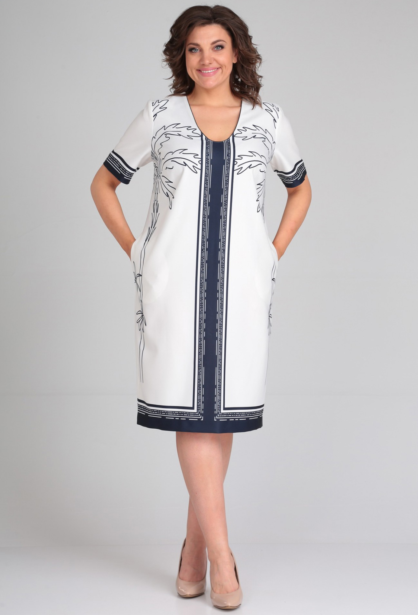 Платье женское полуприлегающего силуэта. Перед с нагрудными вытачками. Спинка с талиевыми вытачками и средним швом по низу которого обработан разрез. Горловина V-образной формы с кантом из отделочной ткани. Рукав втачной одношовный короткий. В боковых швах обработаны карманы. Ткань с декоративным рисунком.