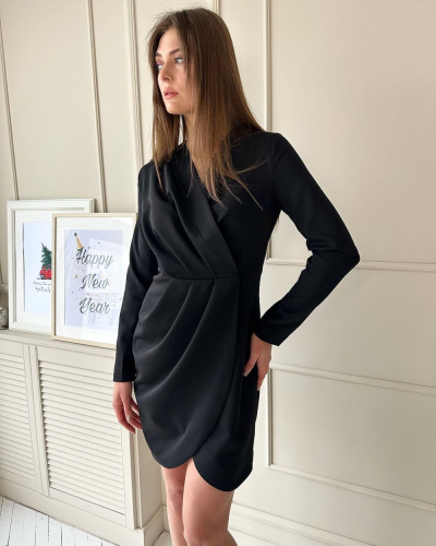 Платье женское полуприлегающего силуэта. Спинка со средним швом. Перед с отрезными бочками, отделанными кантом и широкими лампасами от них до низа из отделочной ткани. Рукав втачной одношовный с приталенными манжетами из отделочной ткани. Горловина V-образной формы с отделочными деталями. В качестве отделки используется нашивка под правым бочком.