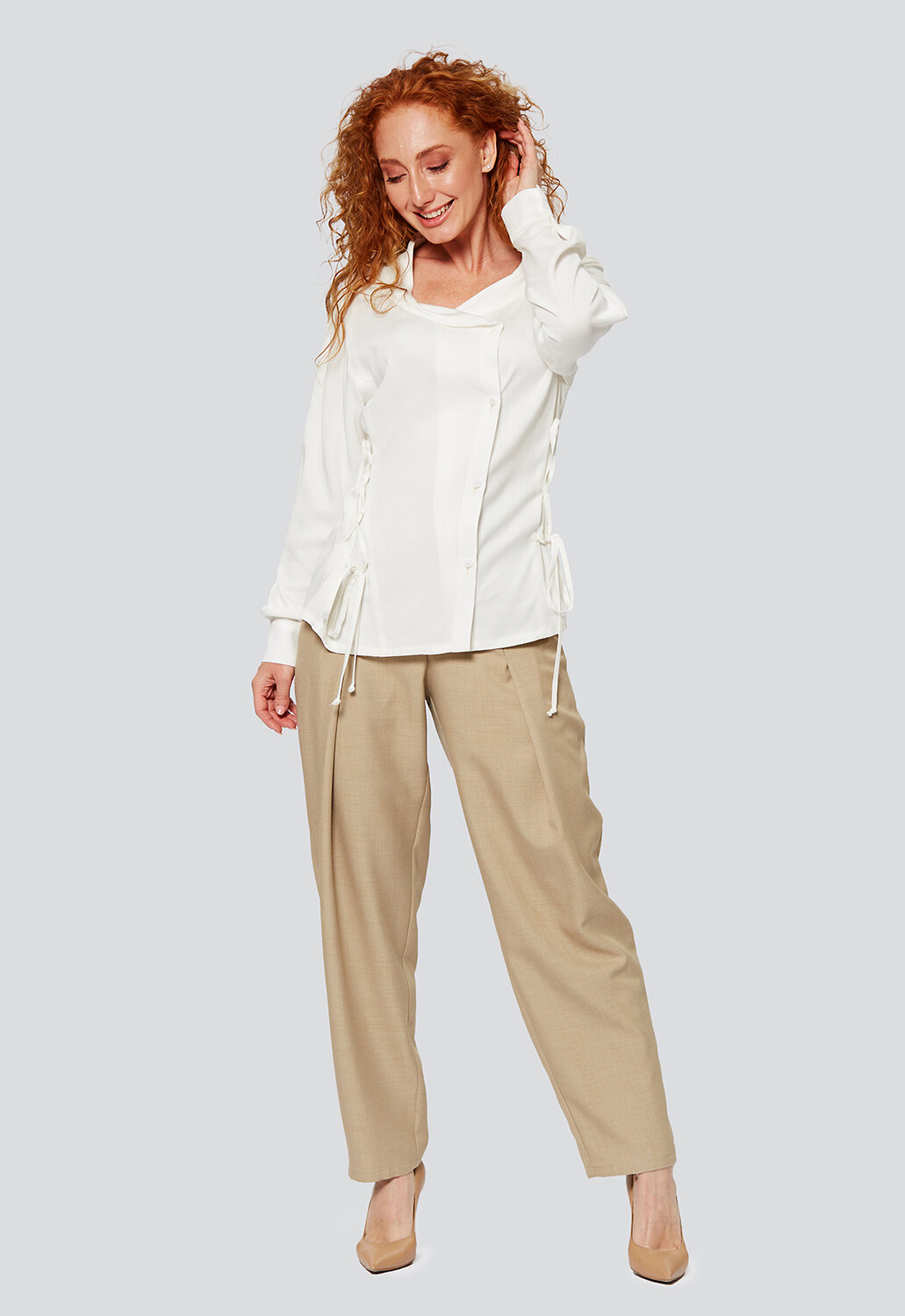 Стильная, очаровательная блузка прямого силуэта с длинным рукавом от российского производителя D’imma Fashion Studio из натуральной ткани - необходимая вещь в женском гардеробе, открывающая новые горизонты при создании образа. Модель с U-образным вырезом, отложным шалевым воротником и асимметричной застежкой на пуговицы на планке, выглядит максимально расслабленно и стильно. Изюминку этой блузе придают рельефы по переду и шнуровки по бокам, которые дополняют образ и формируют силуэт. Свободный крой с возможностью формирования силуэта обеспечит свободу движения и будет изумительно смотреться не только на моделях из дизайнерских коллекций, но и на корпулентных девушках. Блузка является базовой деталью в женском гардеробе и легко выручит современную леди в ситуации из серии «когда нечего надеть». Можно дополнять яркими аксессуарами и менять образ под настроение.