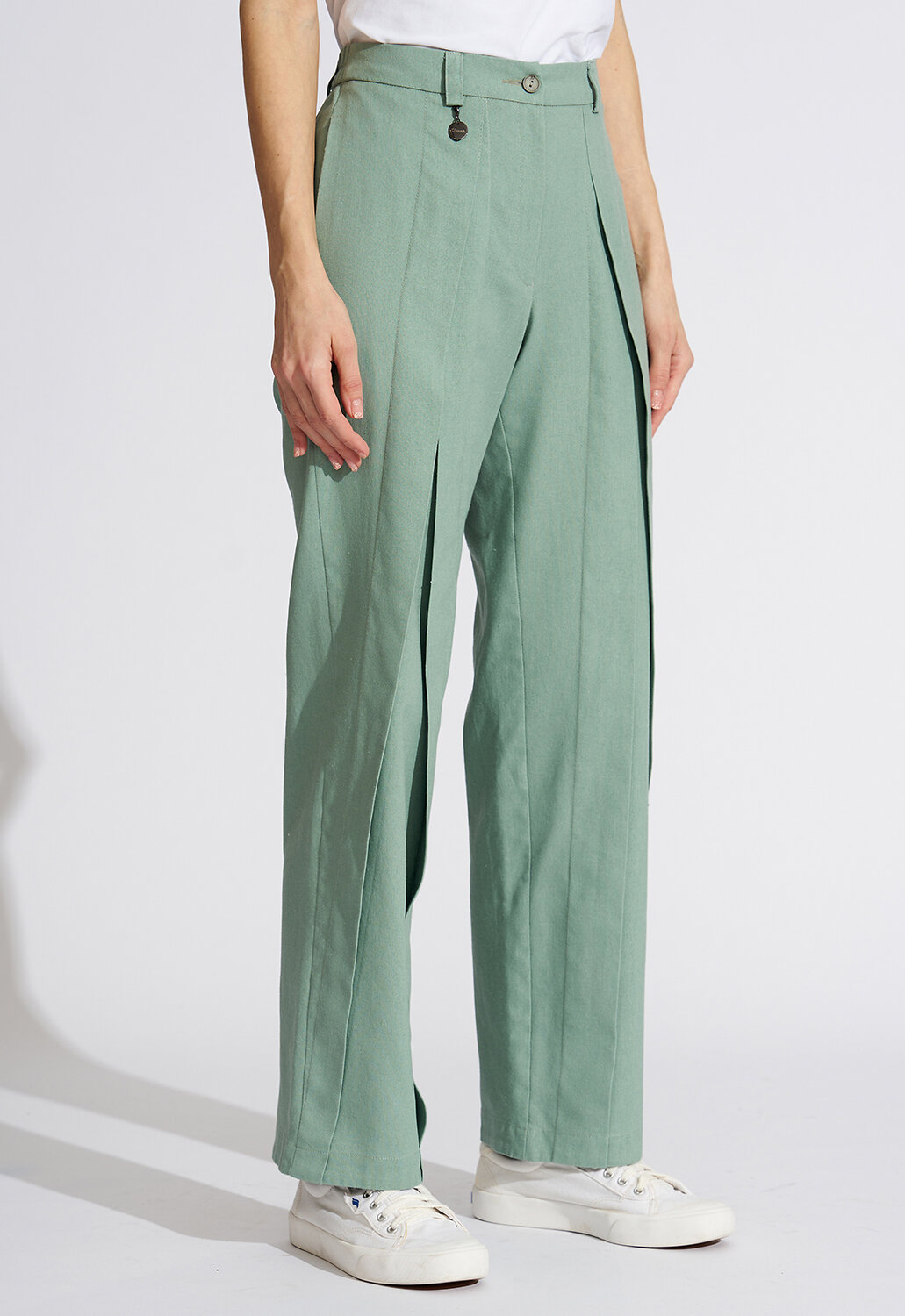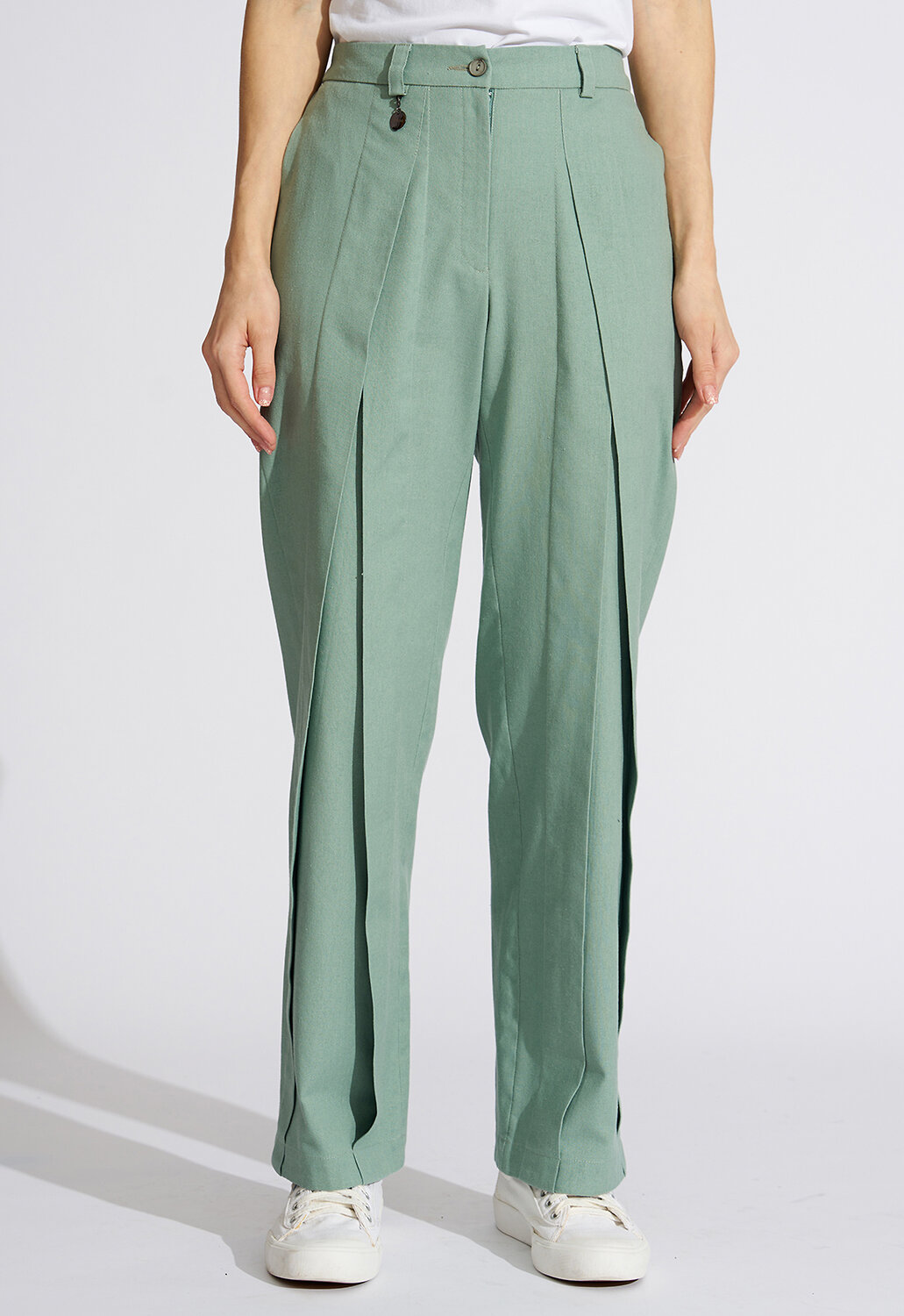 Модные дизайнерские брюки выполнены из смесовой ткани из хлопка, льна и вискозы, что придает силуэту стройность и завершенность, подчеркивая женственность и романтичность. Простота линий кроя сбалансирована яркостью дизайнерской мысли. Прямая модель брюк по переду оформлена встречными складками, встречающимся на талии и визуально удлиняющими женские ножки. Такой фасон универсален и подходит всем девушкам, как высоким, так и низким, худеньким и с фигуркой плюс-сайз. Втачные вертикальные карманы в боковых швах дополняют образ и создают комфорт. Классическая застежка на молнию и пуговицу дополнена удобной резинкой по спинке - это отличный выбор для тех, кто не любит жесткого пояса и хочет, чтобы брюки сели на фигуру максимально комфортно. Прекрасно будут сочетаться как с модельными туфельками на каблучке, босоножками, так и с кедами или кроссовками, создавая новый свежий современный образ. Архитектурность этого изделия и его многоликость дают невероятные возможности для реализации творческой мысли и будут изумительно смотреться не только на моделях из дизайнерских коллекций, но и на девушках с аппетитными формами. Есть большие размеры. Выбрав брюки от D’imma, можно быть уверенной в том, что лук соответствует последним тенденциям моды. Прямой силуэт и ничего лишнего, что может помешать Вам любоваться окружающим миром по дороге на работу, на прогулке в парке или по городу. Не взирая на причуды природы, в такой модели Вы будете выглядеть женственно и неповторимо. Брюки являются базовой деталью в женском гардеробе и легко выручат современную леди в ситуации из серии «когда нечего надеть». Можно дополнять яркими аксессуарами и менять образ под настроение. Разнообразные версии – ключ к созданию линейки модных, индивидуальных луков. Вы убедитесь, что это очень выгодная покупка, которая не будет пылиться в шкафу!