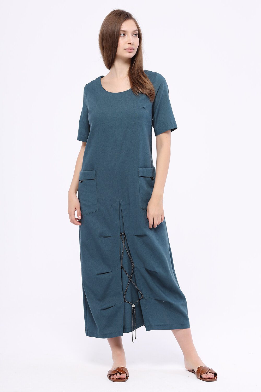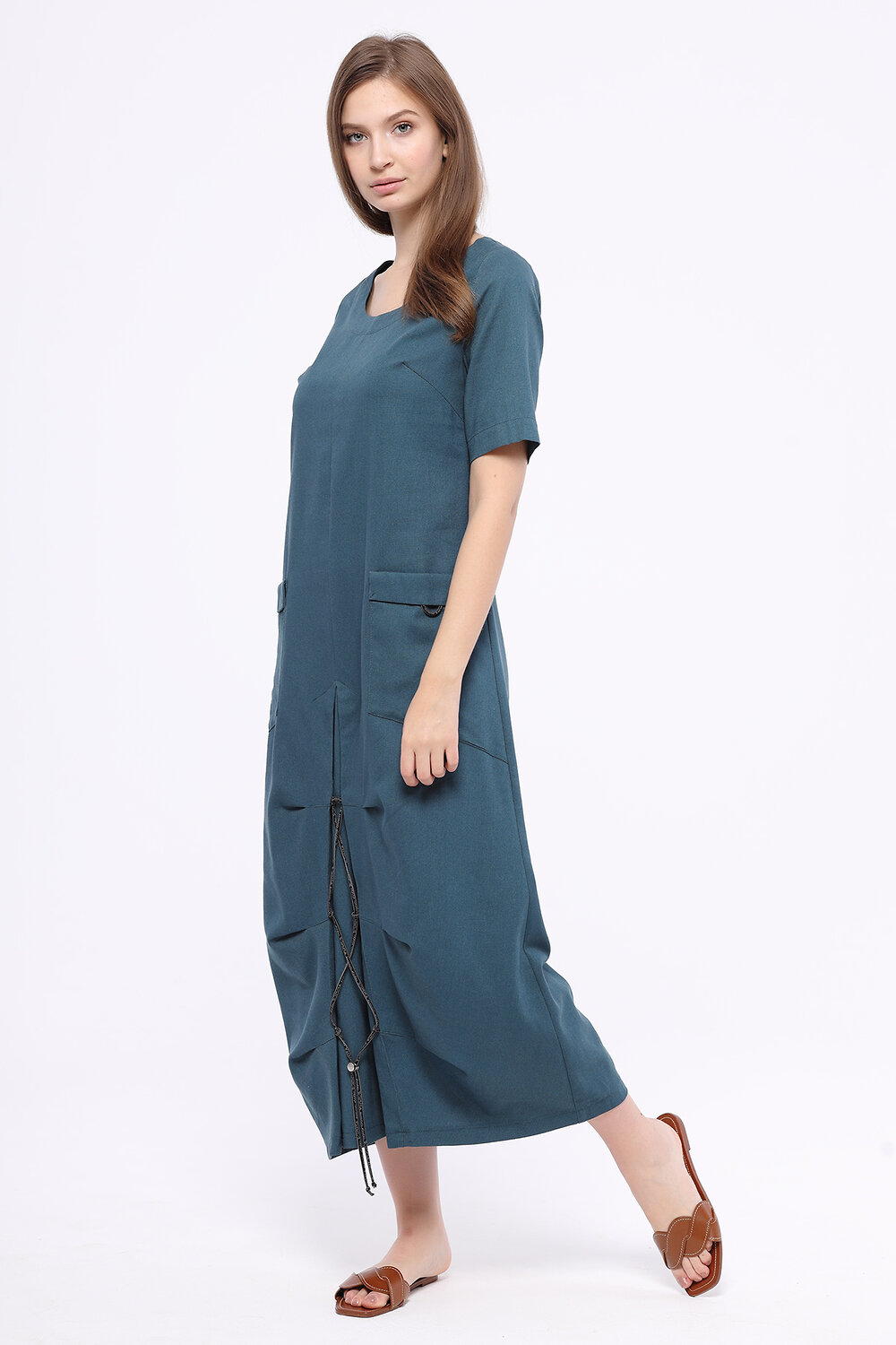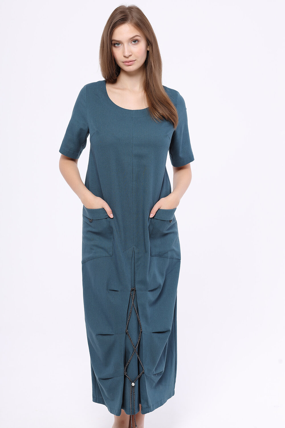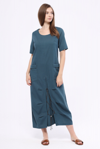 Женственное платье полупрлегающего силуэта с накладными карманами, отделкой по переду декоративной шнуровкой и оригинальными защипами из натуральной смесовой ткани российского производства бренда D'imma.