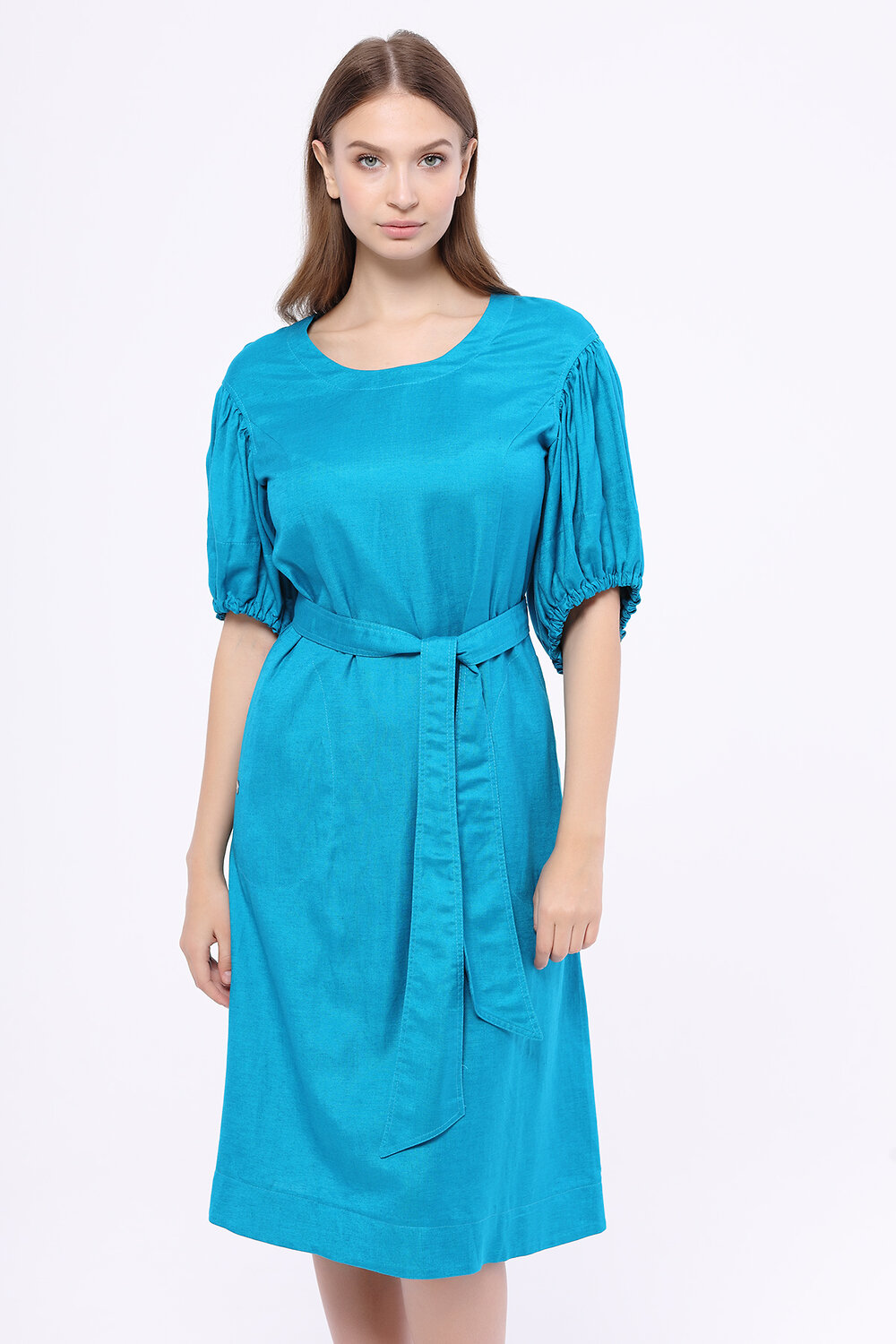 Полуприлегающее платье с круглым вырезом из нтуральной смесовой ткани с рельефами по груди, карманами в боковых швах и дизайнерскими романтичными рукавами. Пояс в комплекте.