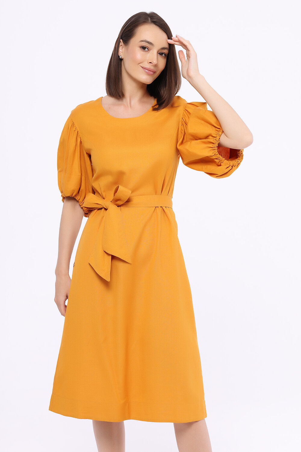 Полуприлегающее платье с круглым вырезом из нтуральной смесовой ткани с рельефами по груди, карманами в боковых швах и дизайнерскими романтичными рукавами. Пояс в комплекте.