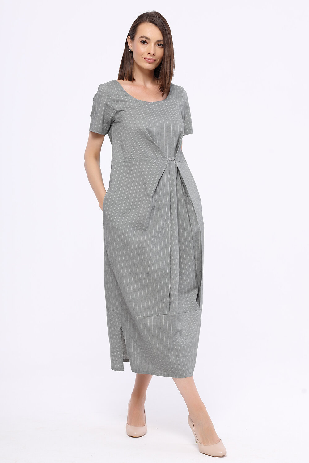 Романтичное летнее платье полуприлегающего силуэта с коротким рукавом и декоративной ассиметричной драпировкой по линии талии из смесовой ткани - лён с полиэстером, российского производства бренда D'imma. Лен в сочетании с полиэстером держит форму, гигроскопичен, менее сминаем. Широкий размерный ряд, в том числе большие размеры.