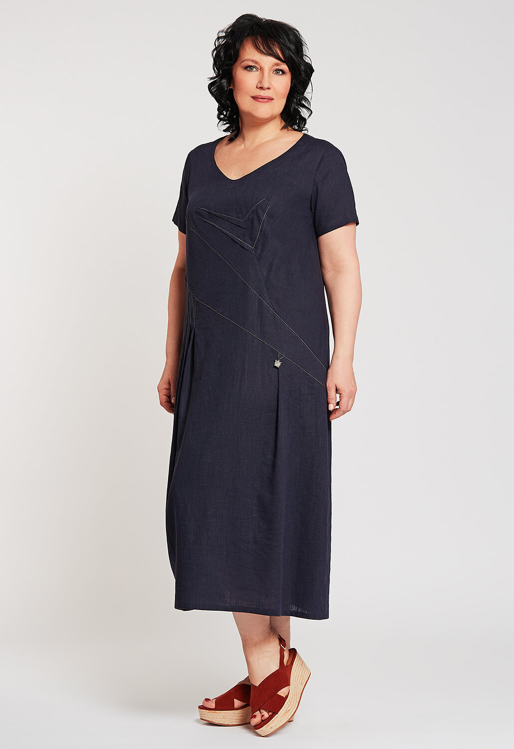 Интересное полуприлегающее платье с декоративными фигурными строчками.