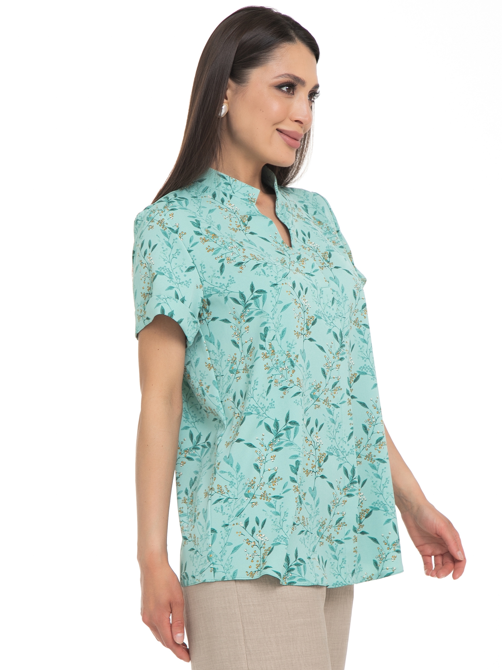Блузка  продуманного и универсального фасона, идеально подходящего под любой низ. Блуза летних расцветок, идеально впишется в любой гардероб: для создания , повседневного или праздничного. Можно носить как с классическими брюками и юбками, так и с джинсами или под сарафан. Прекрасно смотрится как в заправленном состоянии, так и на выпуск. Благодаря легкой ткани блузка обеспечивает идеальный  комфорт в летний зной, не мнется и обладает износостойкостью, Ткань легкая и не просвечивает. Воротник классический на стойке, рукав короткий   с отворотом.