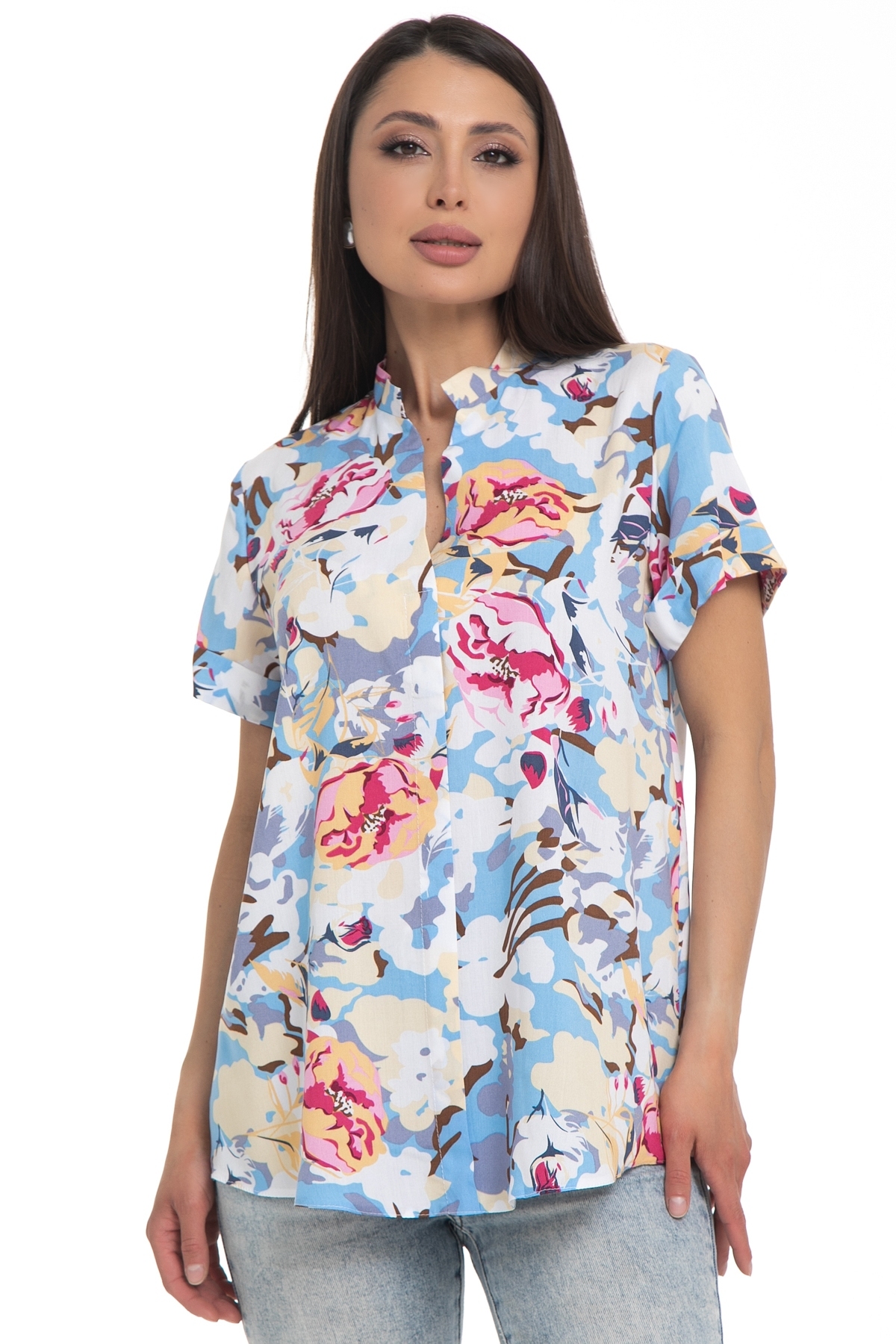 Блузка  продуманного и универсального фасона, идеально подходящего под любой низ. Блуза летних расцветок, идеально впишется в любой гардероб: для создания , повседневного или праздничного. Можно носить как с классическими брюками и юбками, так и с джинсами или под сарафан. Прекрасно смотрится как в заправленном состоянии, так и на выпуск. Благодаря вискозной ткани блузка обеспечивает идеальный  комфорт в летний зной, не мнется и обладает износостойкостью, Ткань легкая и не просвечивает. Воротник классический на стойке, рукав короткий   с отворотом.