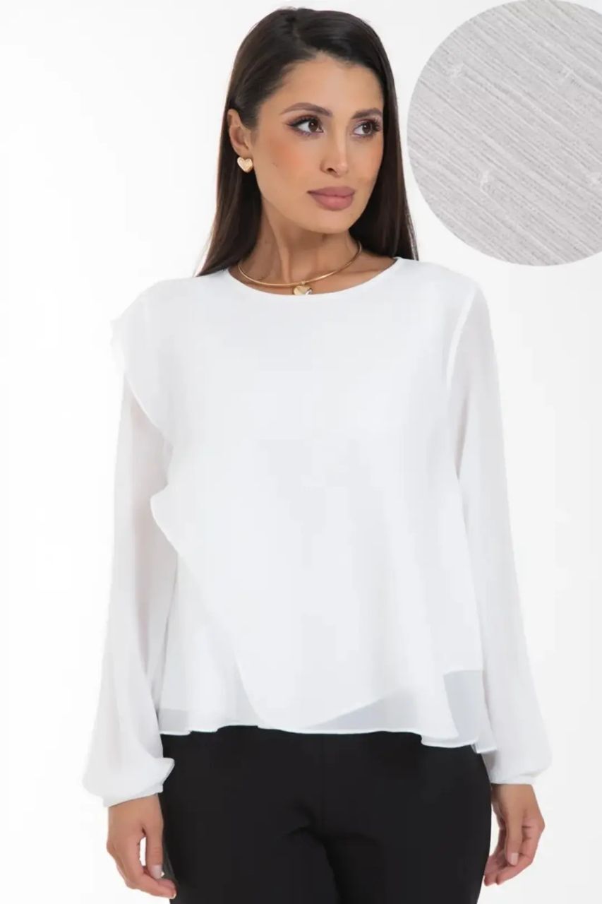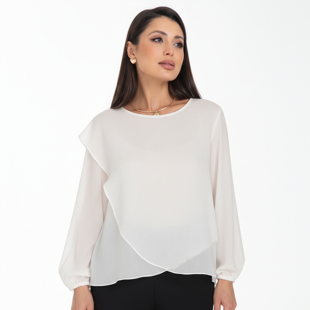 Дизайн блузки — это воплощение современной элегантности. Её оригинальный крой с наложением драпирующих деталей создает динамичный и живописный силуэт. Одно плечо эффектно ниспадает мягким «крылышком», добавляя образу скульптурности и женственности.