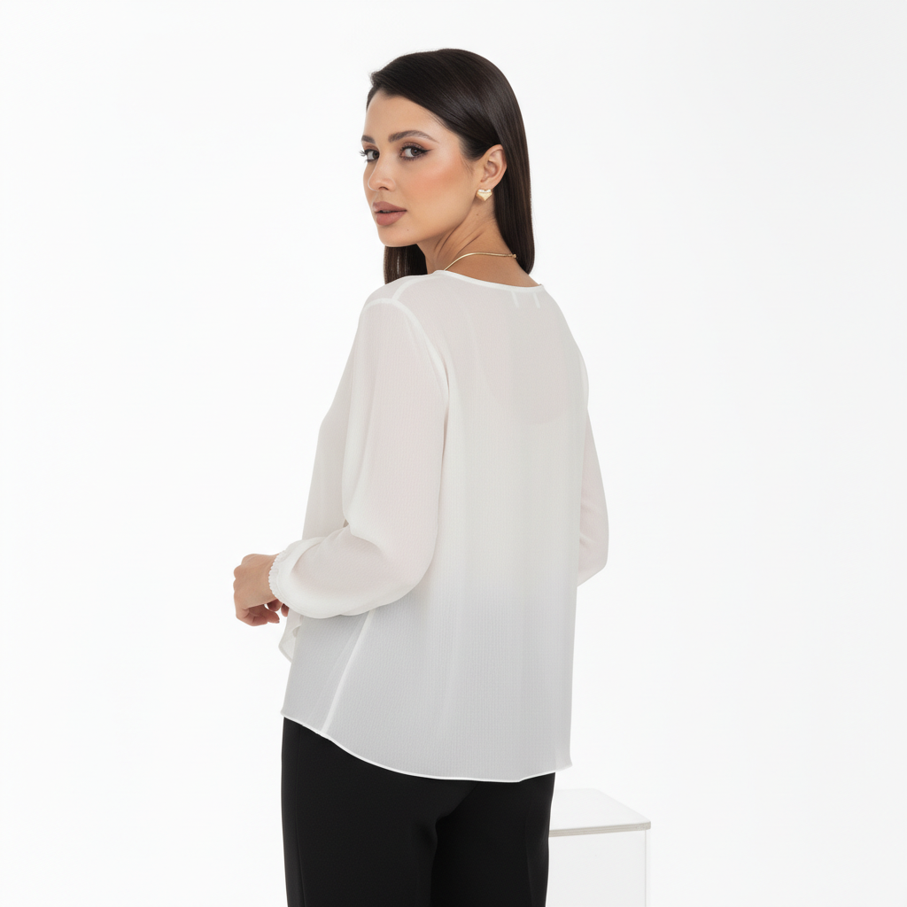 Изысканная блузка, сотканная из очарования. Уникальная жаккардовая фактура шифона придает легкому полотну благородную объемность, игру света и тени, создавая эффект роскошной ткани. Это та деталь, которая превращает простое изделие в предмет искусства.