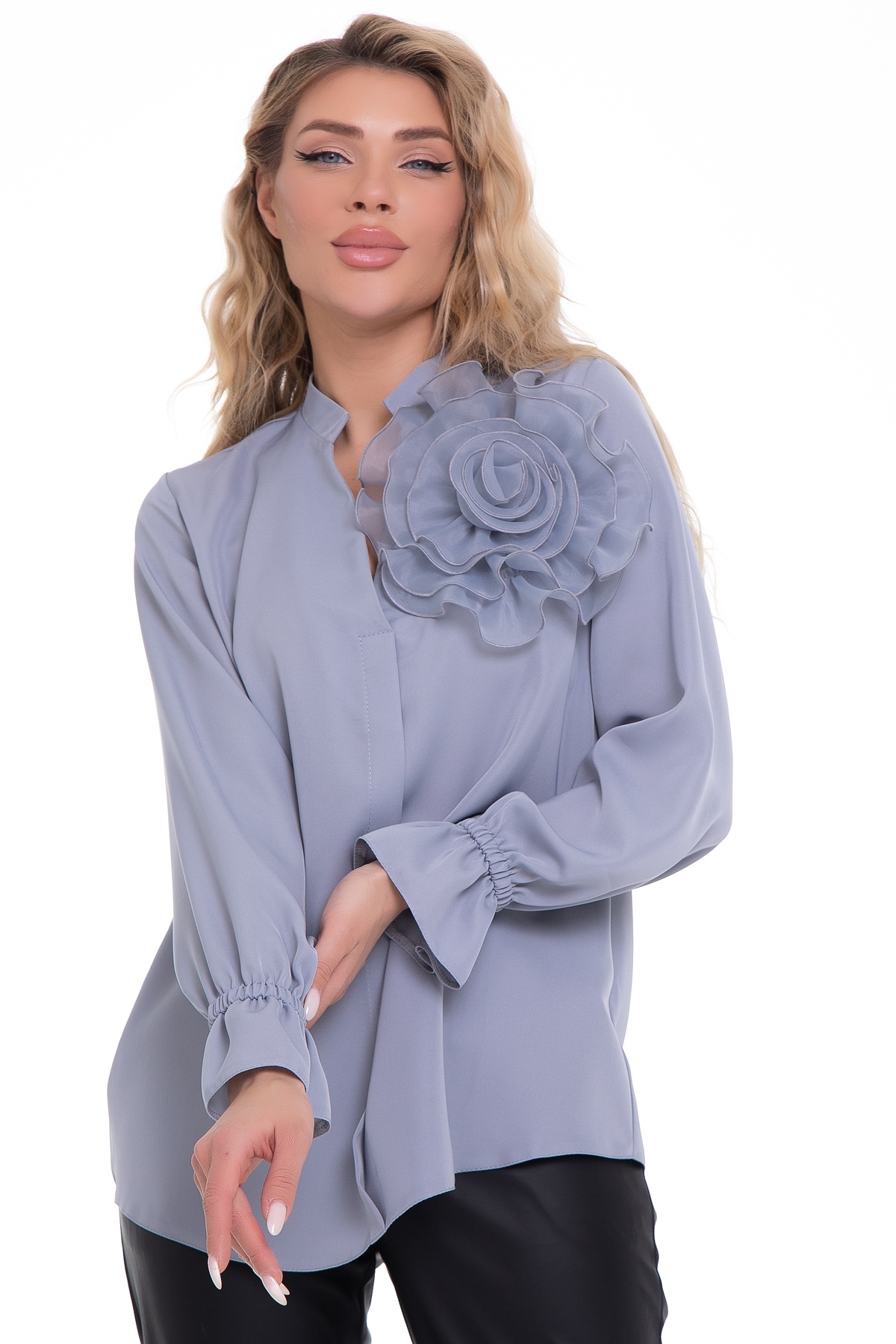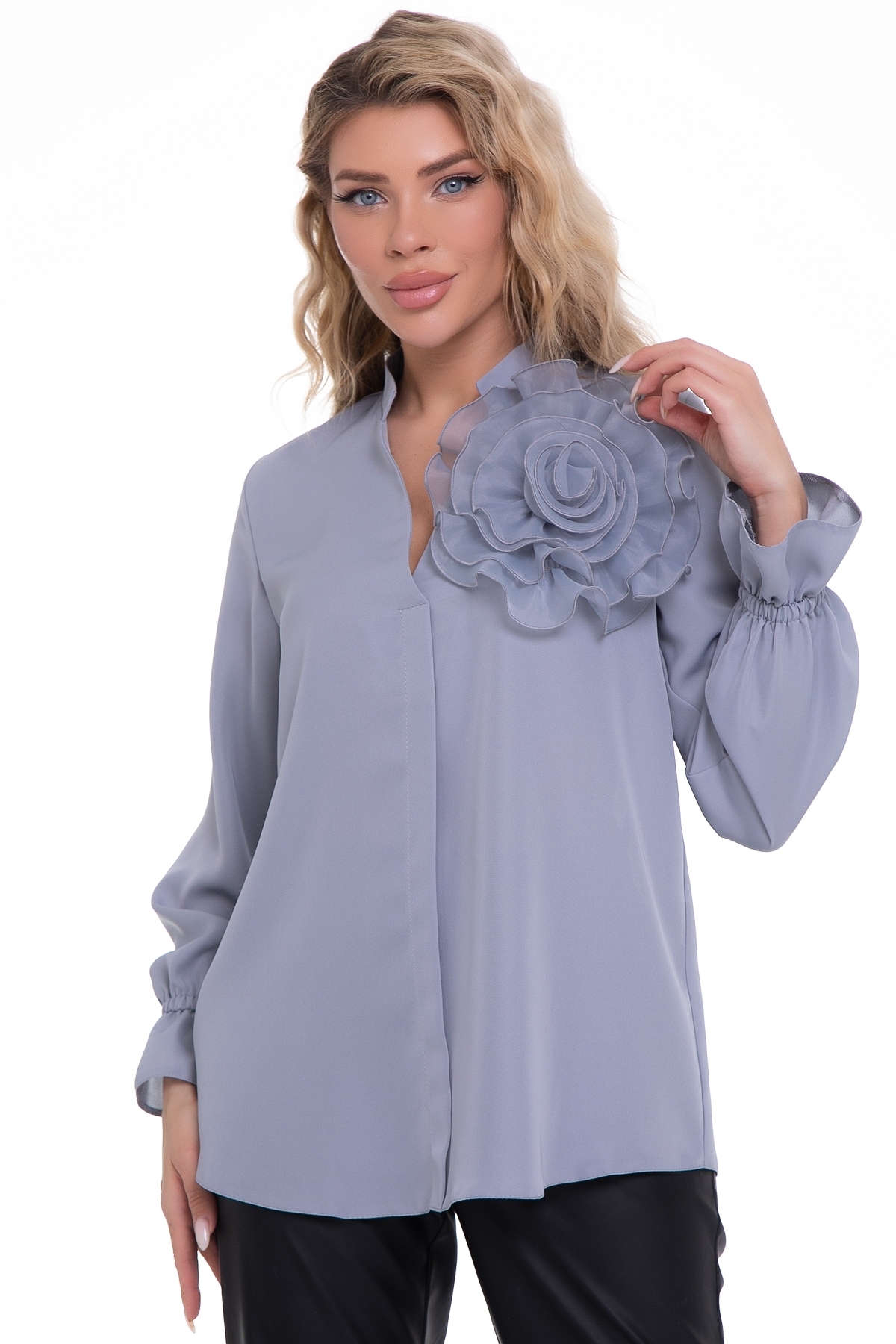 Хит сезона! Необыкновенно красивая и элегантная блуза с изысканным декором- само воплощение женственности. Блузка с изящным цветком из органзы, идеально впишется в любой гардероб: для создания делового образа, повседневного или праздничного. Можно носить как с классическими брюками и юбками, так и с джинсами или под сарафан. Прекрасно смотрится как в заправленном состоянии, так и на выпуск. Шелковистая струящаяся ткань практически не мнется, обладает износостойкостью, обеспечивает идеальный комфорт. Блузка  продуманного и универсального фасона, идеально подходящего под любой низ. Воротник стойка, рукав длинный, на резинке с красивой рюшей по низу