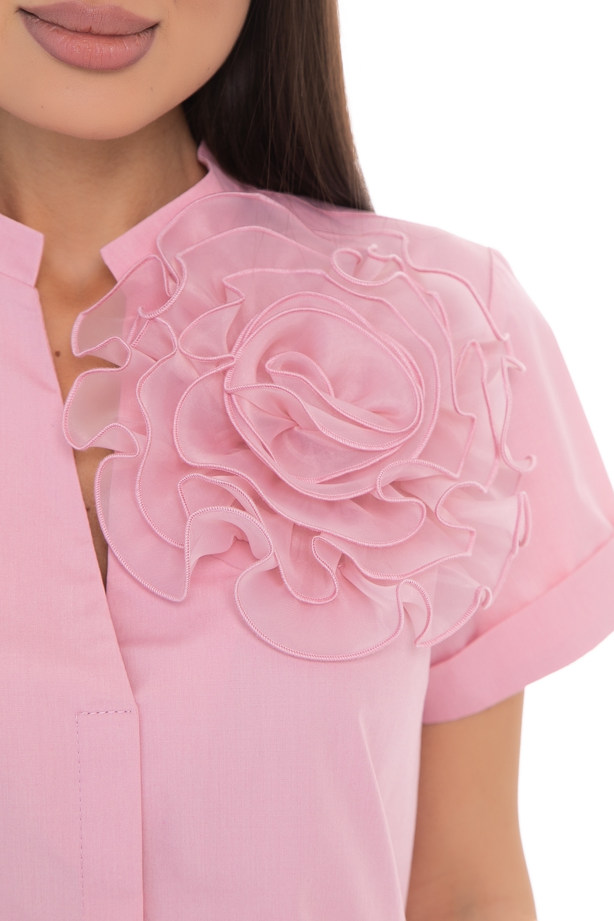 Блузка  продуманного и универсального фасона, идеально подходящего под любой низ. Блуза с изящным цветком из органзы, идеально впишется в любой гардероб: для создания делового образа, повседневного или праздничного. Можно носить как с классическими брюками и юбками, так и с джинсами или под сарафан. Прекрасно смотрится как в заправленном состоянии, так и на выпуск. Благодаря эластану в составе ткани блузка практически не мнется, обладает износостойкостью, обеспечивает идеальный комфорт. Ткань с содержанием хлопка..Воротник стойка, рукав короткий   с манжетом.