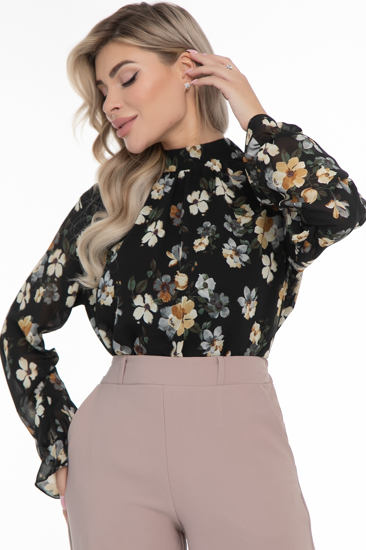 Шифоновая блузка с авторским принтом – настоящая находка для всех модниц! Утонченный благородный дизайн делает ее идеальным выбором для любого особого случая. Легкая, с изящным воротником стойкой, широкие объемные пышные рукава- все это превращает  повседневный образ в необычный и оригинальный. В этой красивой блузе из шифона вы всегда будете выглядеть потрясающе! Прямая свободная блуза с идеальной посадкой на любую фигуру, ее легко сочетать с брюками, джинсами или юбкой, надевать под пиджак или жакет. Воротник стойка сзади переходит в завязки с длинными концами, из которых получается великолепный бант. Можно сделать свободный узел и оставить ленты, либо перекинуть их вперед, создав тем самым новый образ. Рукав длинный, на резинке с красивой рюшей по низу.