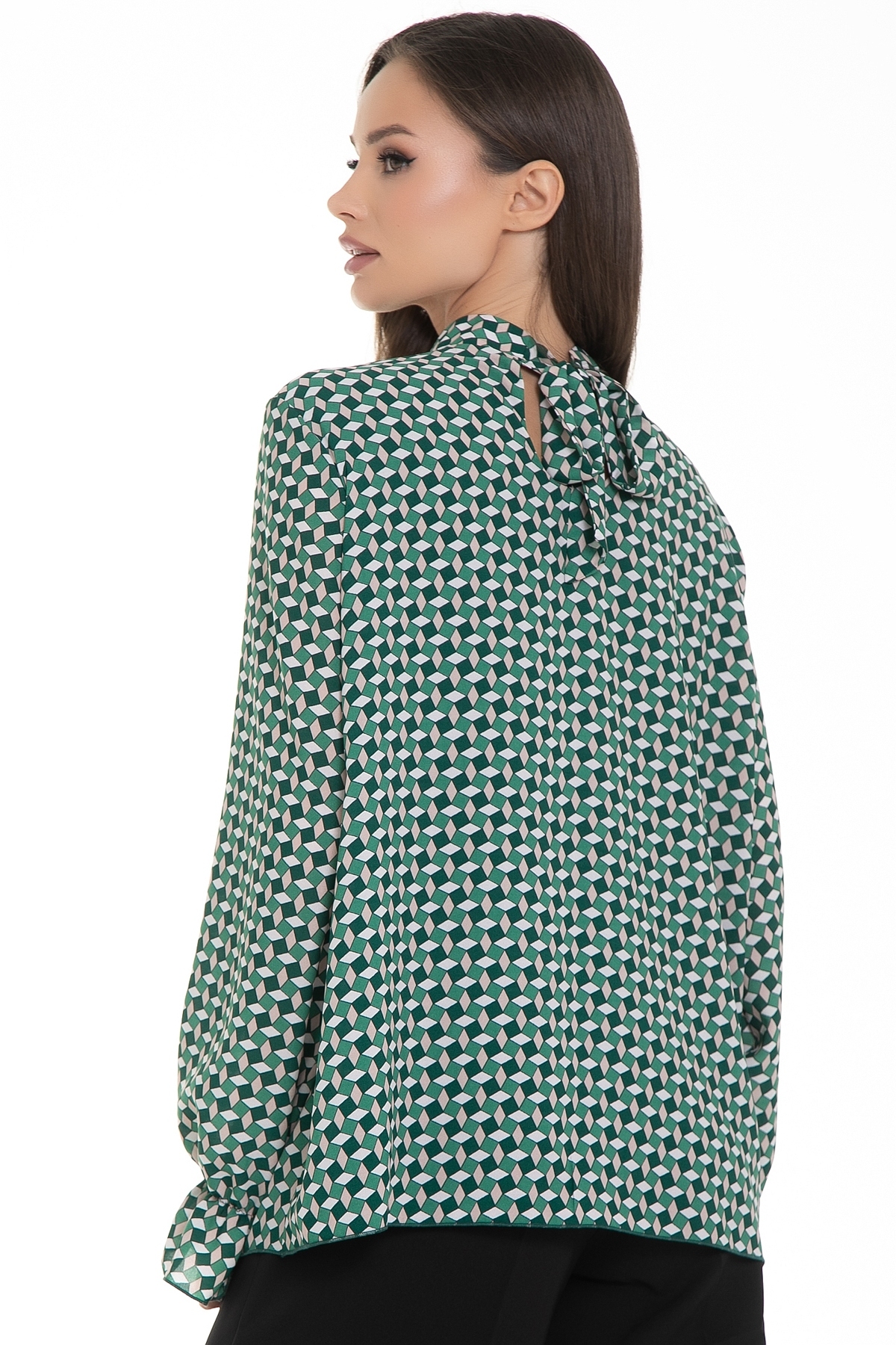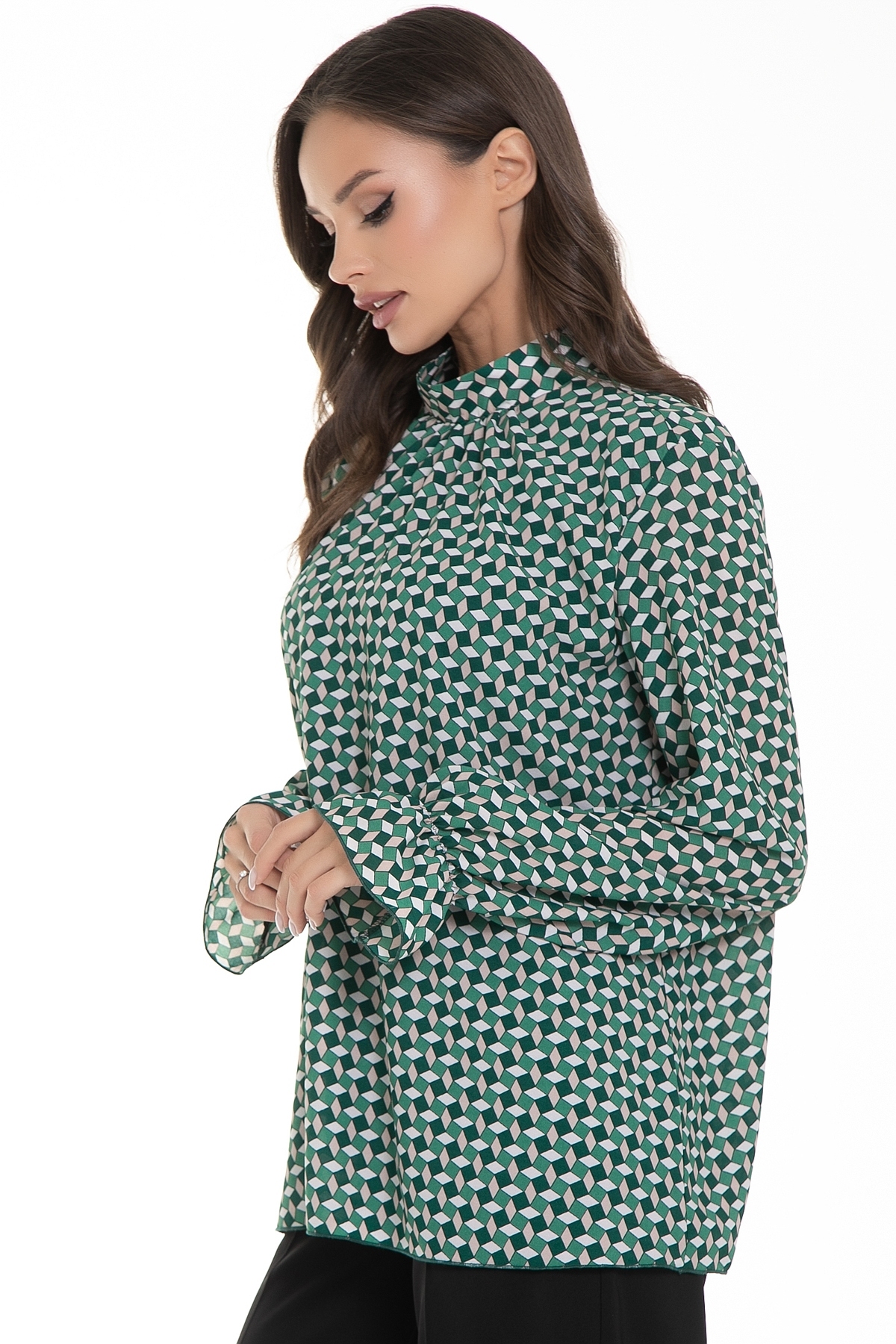 Шифоновая блузка с авторским принтом – настоящая находка для всех модниц! Утонченный благородный дизайн делает ее идеальным выбором для любого особого случая. Легкая, с изящным воротником стойкой, широкие объемные пышные рукава- все это превращает  повседневный образ в необычный и оригинальный. В этой красивой блузе из шифона вы всегда будете выглядеть потрясающе! Прямая свободная блуза с идеальной посадкой на любую фигуру, ее легко сочетать с брюками, джинсами или юбкой, надевать под пиджак или жакет. Воротник стойка сзади переходит в завязки с длинными концами, из которых получается великолепный бант. Можно сделать свободный узел и оставить ленты, либо перекинуть их вперед, создав тем самым новый образ. Рукав длинный, на резинке с красивой рюшей по низу.