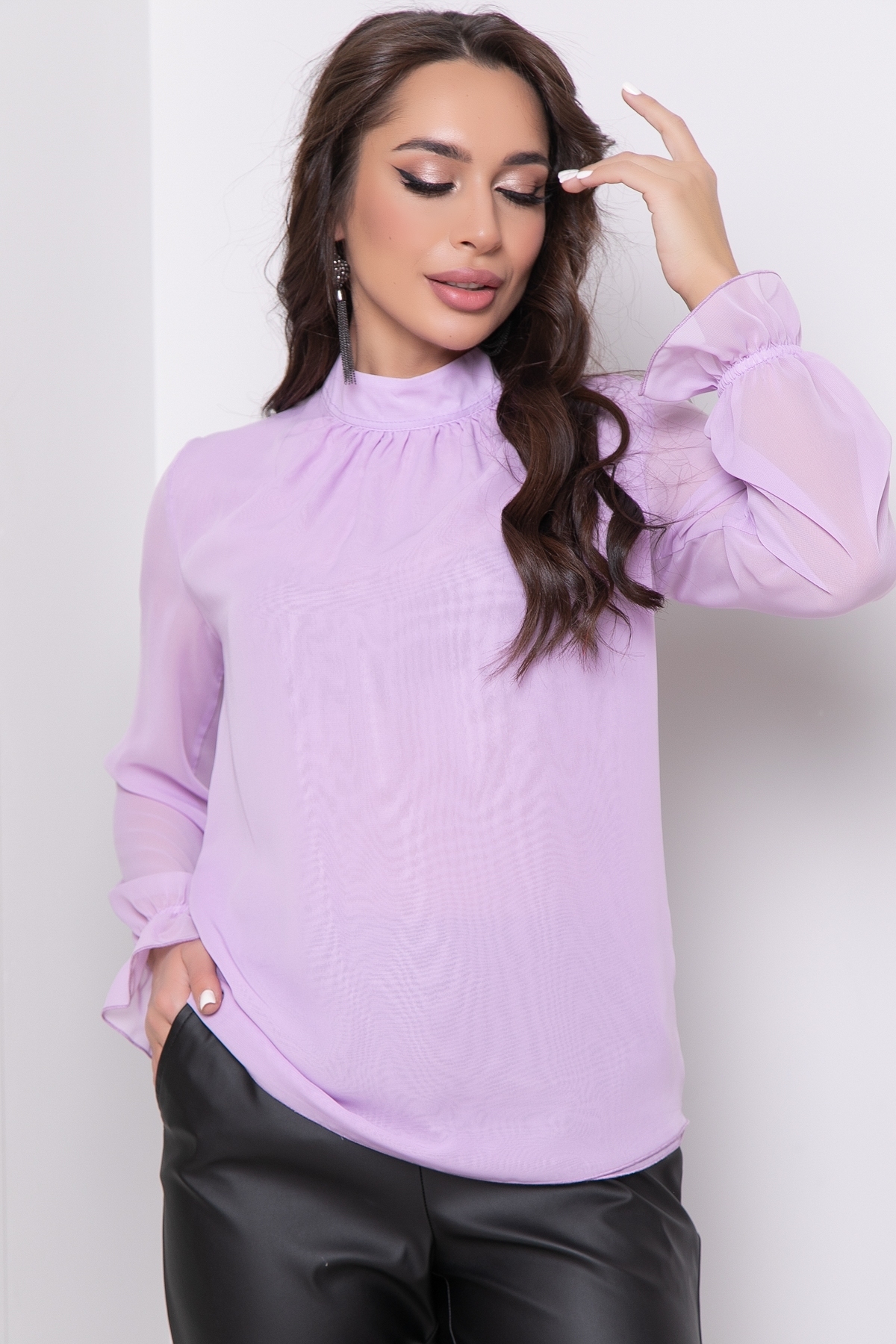 Восхитительная блузка из воздушного шифона с объемными широкими рукавами выглядит изысканно и стильно. Блуза прямого свободного фасона подойдет как для создания вечернего образа, так и для офисного стиля, ее легко сочетать с брюками, джинсами или юбкой, надевать под пиджак или жакет. Перед и спинка из двух слоев ткани. Воротник стойка сзади переходит в завязки с длинными концами, из которых получается великолепный бант. Можно сделать свободный узел и оставить ленты, либо перекинуть их вперед, создав тем самым новый образ. Придумывайте, творите и восхищайте!