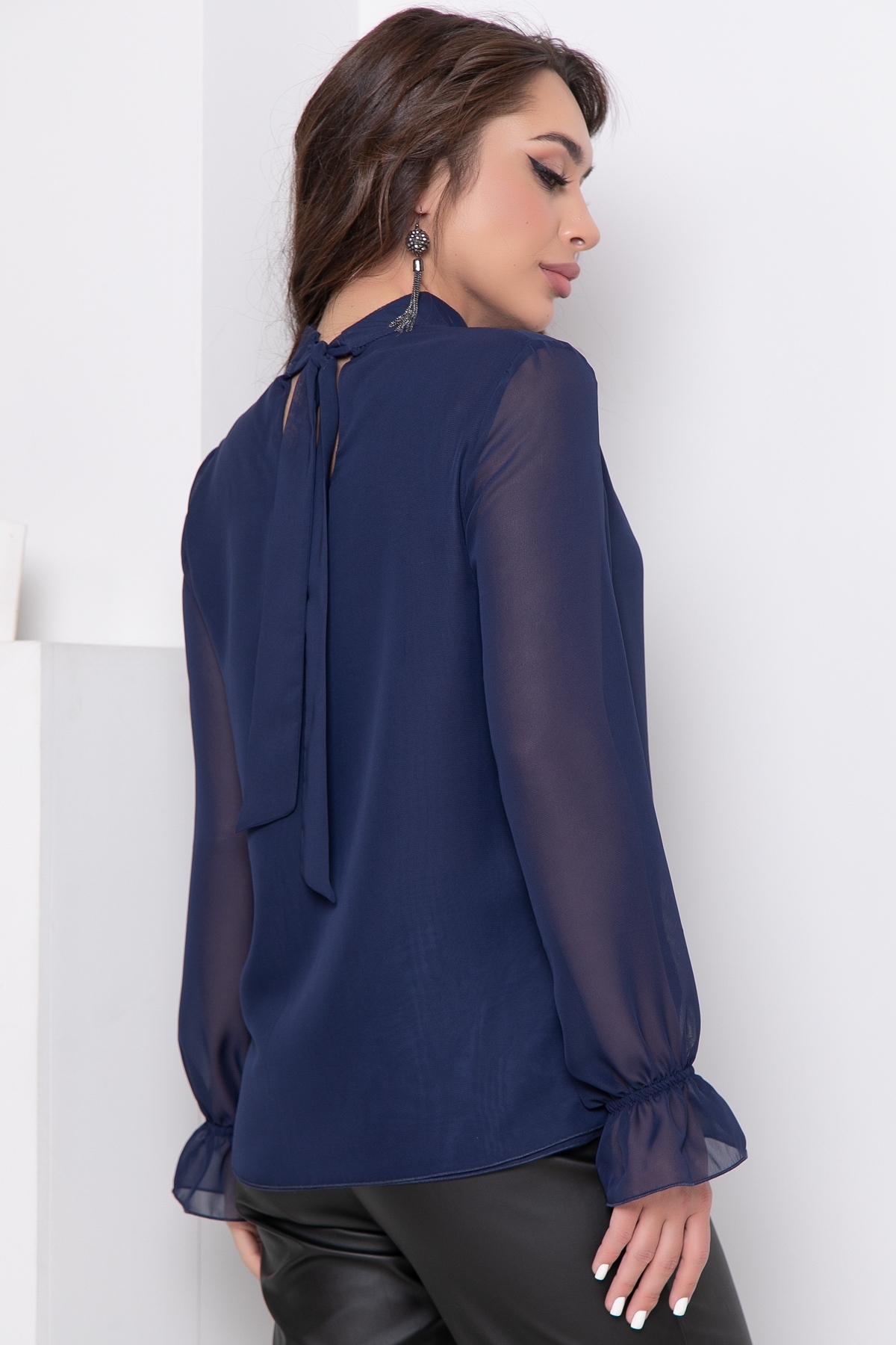 Восхитительная блузка из воздушного шифона с объемными широкими рукавами выглядит изысканно и стильно. Блуза прямого свободного фасона подойдет как для создания вечернего образа, так и для офисного стиля, ее легко сочетать с брюками, джинсами или юбкой, надевать под пиджак или жакет. Перед и спинка из двух слоев ткани. Воротник стойка сзади переходит в завязки с длинными концами, из которых получается великолепный бант. Можно сделать свободный узел и оставить ленты, либо перекинуть их вперед, создав тем самым новый образ. Придумывайте, творите и восхищайте!