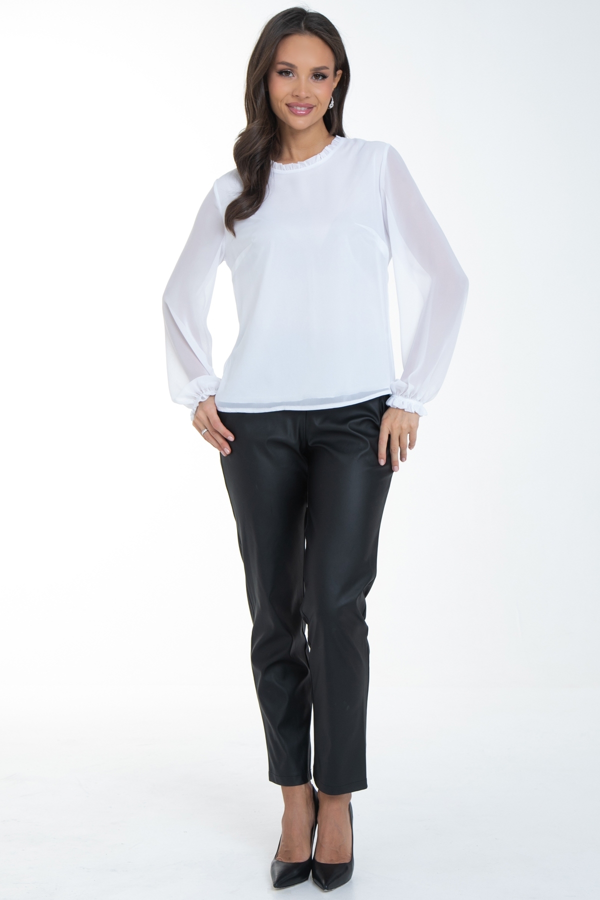 Очаровательная свободная шифоновая блузка, подчеркивающее женственность - отличное решение на каждый день или на праздник для современной стильной женщины. Шикарная модель с объемными длинными рукавами выполнена из высококачественного шифона. Круглая горловина оформлена рюшей с застежкой на пуговицу на спине. Нежная блузка  из шифона на трикотажном подкладе, по переду сделаны вытачки на грудь, рукава втачные, пышные, длинные, снизу собраны на резинку.