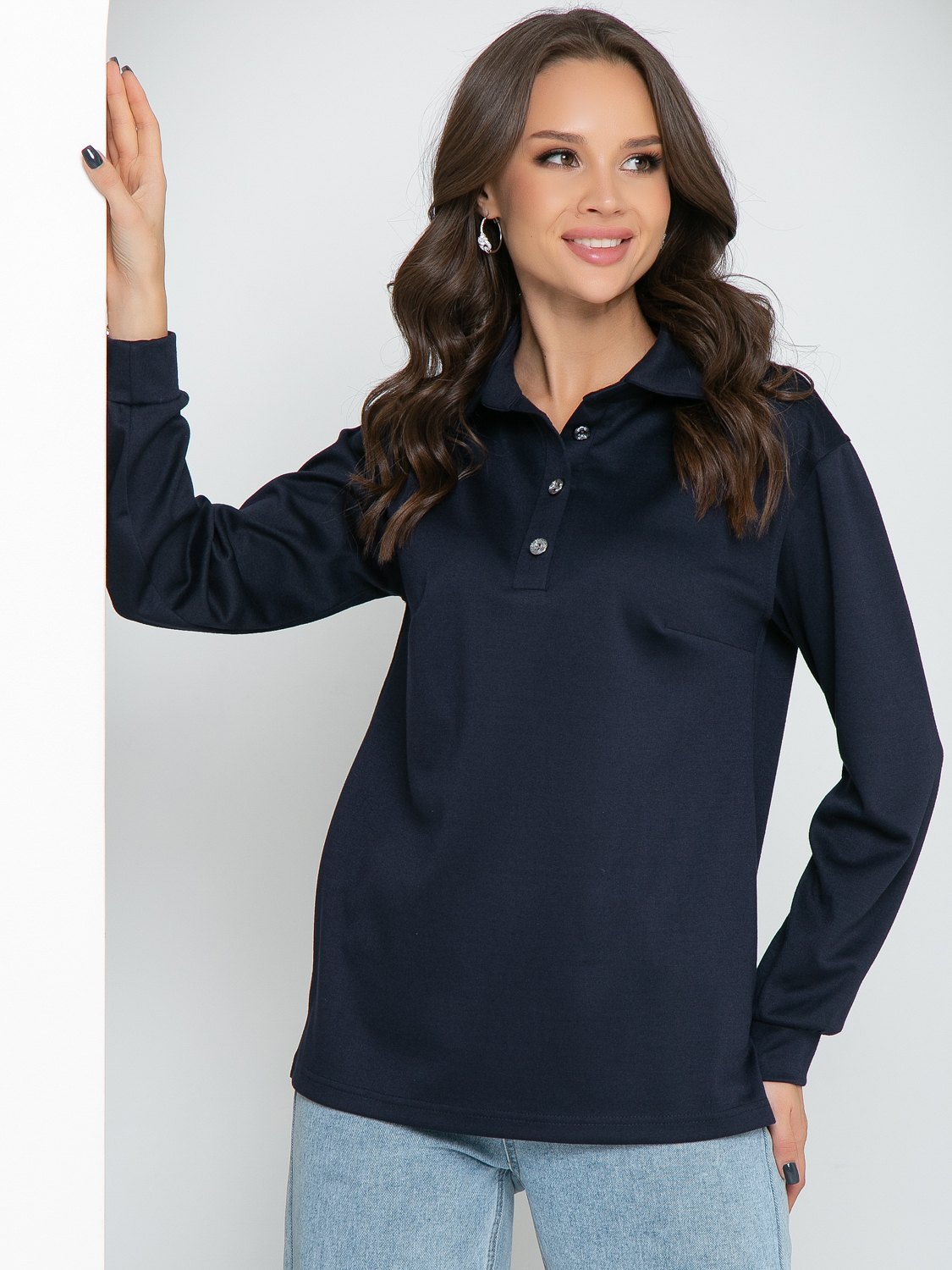 Свободный трикотажный джемпер поло с длинным рукавом- удобная и стильная одежда на все сезоны. По горловине пришит воротничок на стойке, спереди сделана планка с пуговичками. Рукав втачной, немного спущен, внизу на манжете. По боковым швам снизу сделаны разрезы