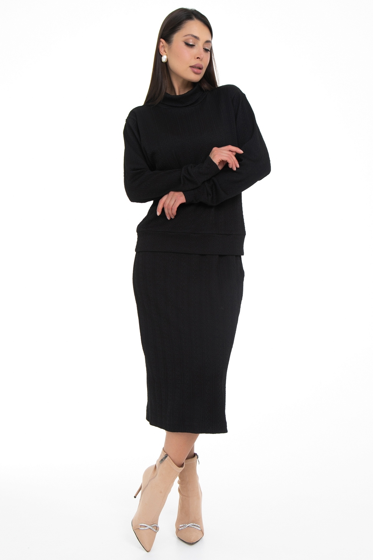 Трикотажный костюм с юбкой состоящий из кофты свитшота и прямой юбки длины миди идеально подойдет как офисный, деловой, нарядный, праздничный, а так же повседневный костюм! Костюм двойка выполнен из качественной ткани трикотаж- вискоза и эластан в составе обеспечивают хорошую посадку на фигуре, интересный узор добавляет текстурности. Костюм имеет свободный силуэт, очень удобный и комфортный, не сковывающий движения, но в тоже время стильный и модный. Юбка на мягком поясе с резинкой внутри, на трикотажной подкладе по всей длине, благодаря чему юбка совсем не просвечивает. Комплект с юбкой- это всегда множество образов в разных стилях, поскольку можно носить каждый элемент сочетая с другой одеждой!