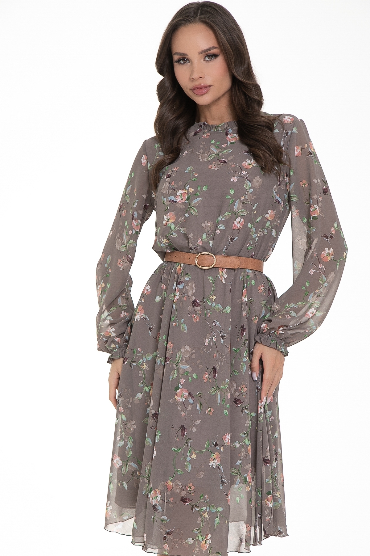 Восхищайте и удивляйте! Элегантное  шифоновое платье, подчеркивающее женственность - отличное решение на каждый день или на праздник для современной стильной женщины. Шикарная модель с пышными красивыми рукавами выполнена из высококачественного шифона с авторским цветочным принтом. Очаровательное свободное платье с юбкой полу-солнце создаст нежный воздушный образ! Круглая горловина оформлена рюшей с застежкой на пуговицу на спине. Платье имеет идеальную посадку благодаря индивидуальной корректировки длины за счет мягкой комфортной резинки на талии. По переду сделаны вытачки на грудь. Платье отрезное по талии. Рукава втачные длинные, снизу подогнуты и сосборены на резинку. Платье с подкладом, притачным по горловине и пройме. Без ремня, ремень как пример образа.