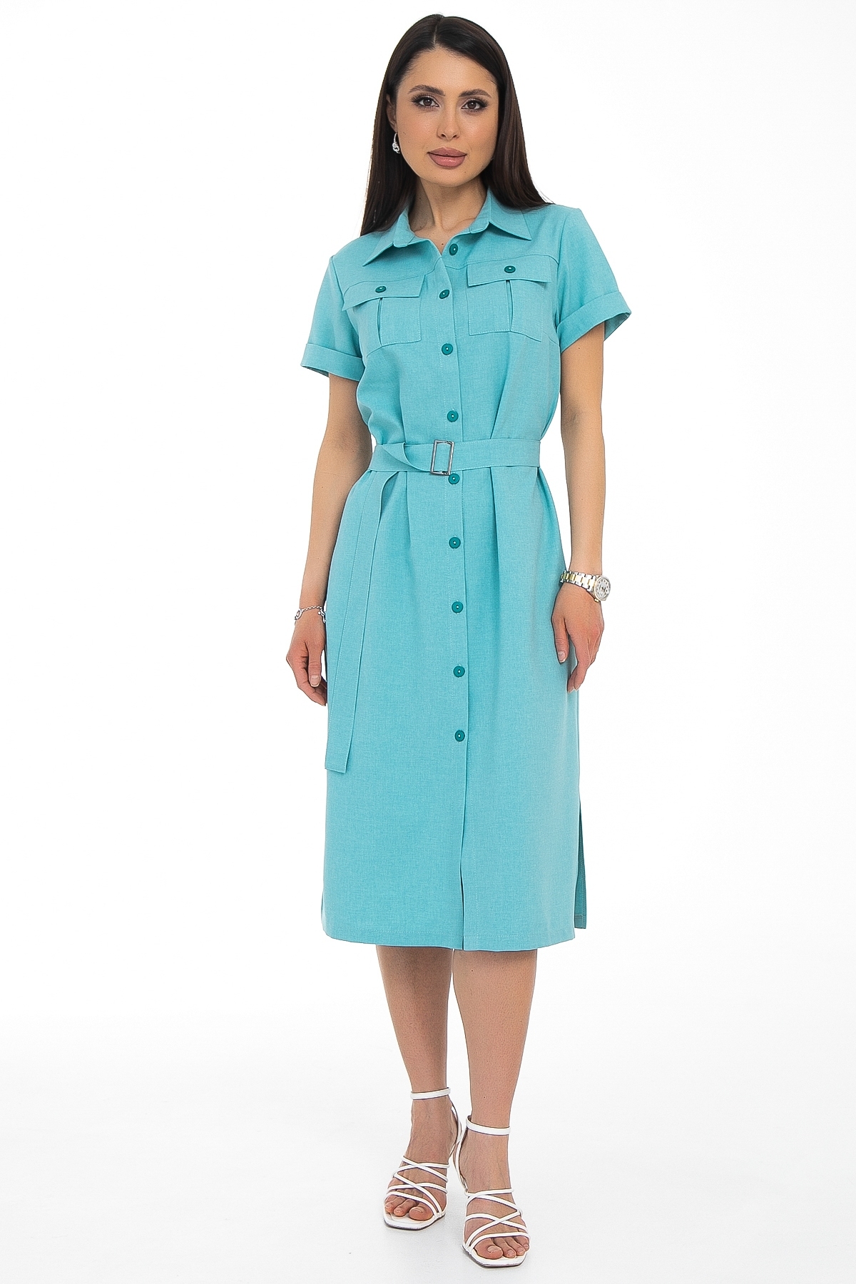 Модное платье-рубашка из летней лёгкой костюмной ткани меланж с плетением "под лён" с вискозой в составе. Платье прямое, с идеальной посадкой, декоративными элементами в виде пуговиц и пряжки. Накладные карманы в области груди создают трендовый образ лета 2025 года. Платье застёгивается спереди на петли-пуговицы. Воротничок на стойке, по переду сделаны вытачки на грудь. На груди накладные карманы с пуговицами. По спинке сделаны две вытачки приталивания. Рукав короткий, втачной, с манжетом. В области талии и бёдер свободного прилегания. Платье дополняется поясом из основной ткани с красивой пряжкой.