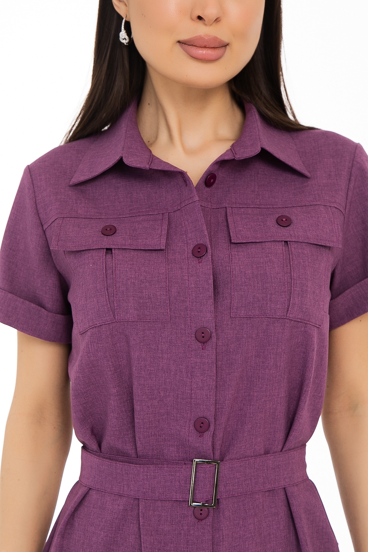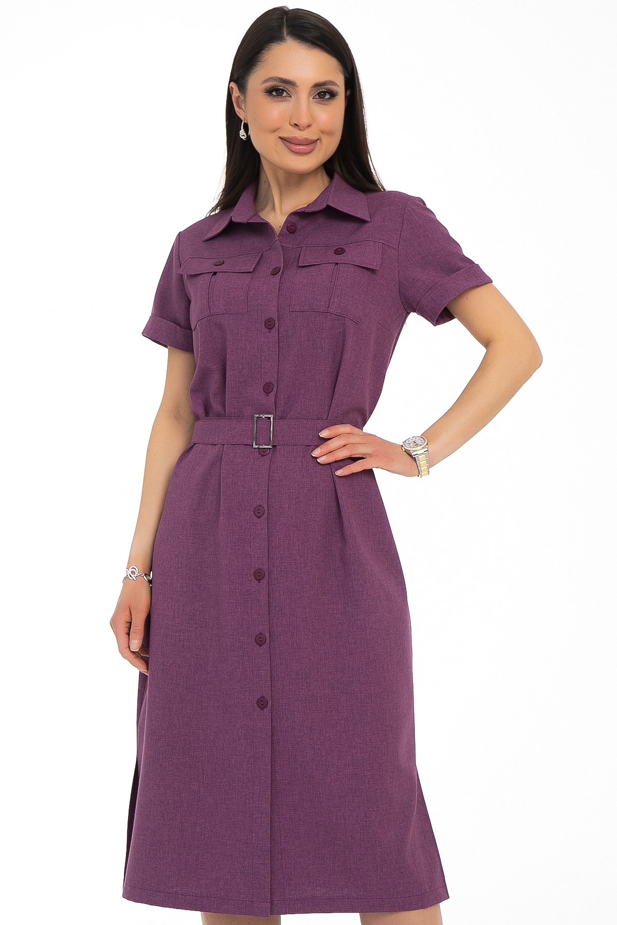 Модное платье-рубашка из летней лёгкой костюмной ткани меланж с плетением "под лён" с вискозой в составе. Платье прямое, с идеальной посадкой, декоративными элементами в виде пуговиц и пряжки. Накладные карманы в области груди создают трендовый образ лета 2025 года. Платье застёгивается спереди на петли-пуговицы. Воротничок на стойке, по переду сделаны вытачки на грудь. На груди накладные карманы с пуговицами. По спинке сделаны две вытачки приталивания. Рукав короткий, втачной, с манжетом. В области талии и бёдер свободного прилегания. Платье дополняется поясом из основной ткани с красивой пряжкой.