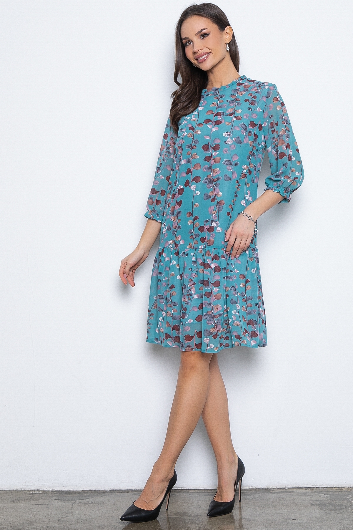 Стильное воздушное платье трапеция с изысканным цветочным принтом эффектно смотрится на любом типе фигуры и станет лучшим дополнением вашего гардероба! Выполненное из высококачественного шифона, это платье А-силуэта гармонично сидит и скрывает все недостатки. Красивое трендовое платье свободного кроя шикарно выглядит, как с туфлями на каблуке, так и с кедами. Меняйте свой образ в зависимости от настроения! Круглая горловина оформлена рюшей с застежкой на пуговицу на спине. Расклешенное платье с воланом по низу, по переду сделаны вытачки на грудь, рукава втачные пышные, длиной 3/4, снизу собраны на резинку. Шифоновое платье на трикотажном подкладе. Платье дополнено пояском из основной ткани, который прикреплён легкой строчкой к боковому шву, которая легко убирается самостоятельно.