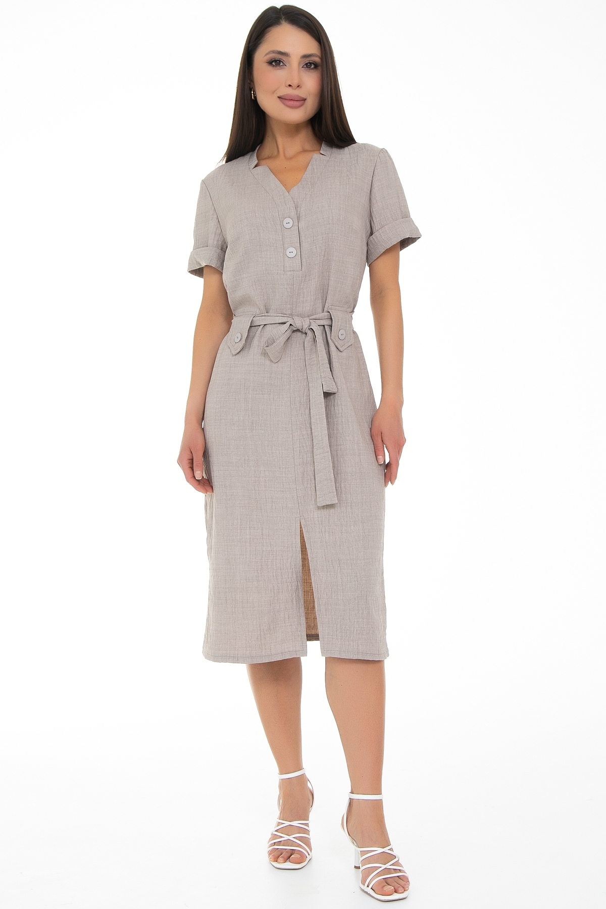 Стильный и удобный вариант летнего платья от  Diolche. Верх платья украшает фигурная планка с имитацией застежки на пуговки. Горловина спинки обработана внутренней обтачкой, по низу платья впереди пикантный разрез.Рукава втачные короткие на манжетах. Модель выполнена из  вискозной ткани  с эффектом жатки.