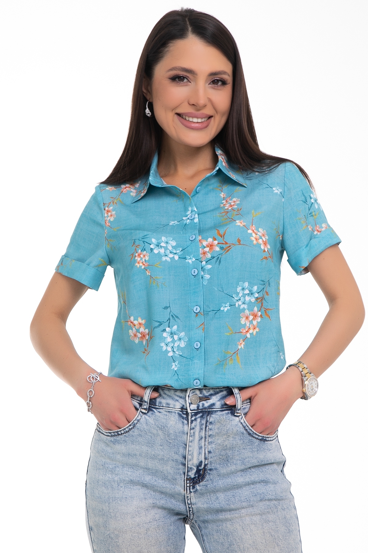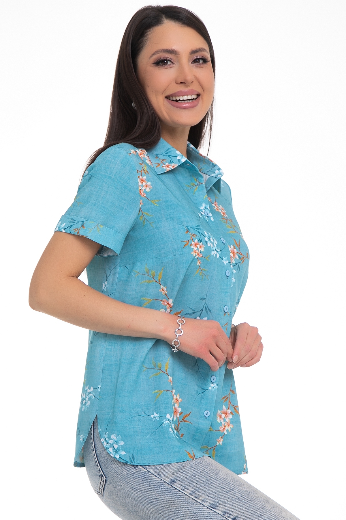 Возьмите в свой гардероб лучшую рубашку для самых запоминающихся приключений. Нежный принт превратит обычные прогулки в квест "Собрать ещё больше комплиментов". Рубашка с воротничком на стойке, спереди застёгивается на петли пуговицы. Немного приталенный силуэт. По спинке кокетка и небольшие вытачки. Рукава короткие с манжетом, который отворачивается наверх. Закругленные разрезы по бокам для удобства. Универсальная вещь, отлично сочетается с юбкой, брюками, джинсами.