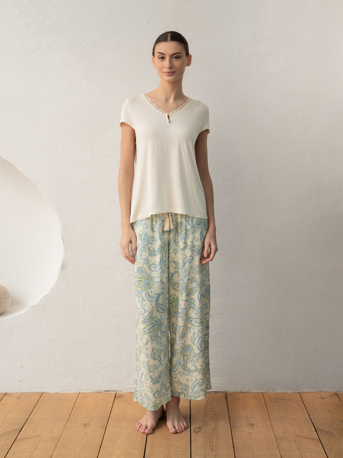Пижама женская состоит из футболки и брюк. Футболка прямого свободного кроя изготовлена из бамбукового трикотажа и выполнена в классическом белом цвете. Имеет короткие рукава и V-образный вырез в зоне декольте, обрамленный кружевом, застёгивающийся на две пуговицы. Брюки прямого свободного кроя изготовлены из вискозной ткани, имеют мягкую тянущуюся резинку на талии с регулирующим шнурком. Брюки дополнены боковыми карманами и украшены цветочным принтом.