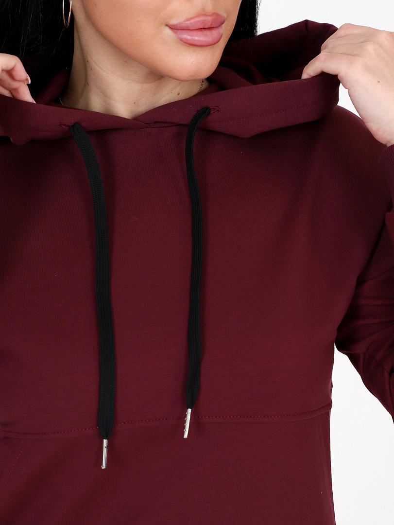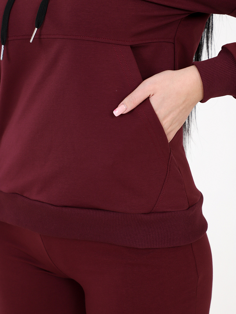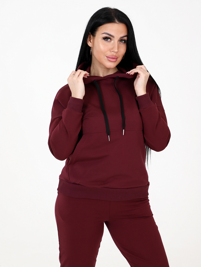 Костюм женский состоит из толстовки и брюк. Костюм выполнен из футер 2-х нитка. Толстовка свободного кроя, с капюшоном и карманом кенгуру. Штаны свободного силуэта с карманами. Низ штанов на манжетах.