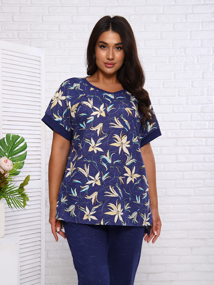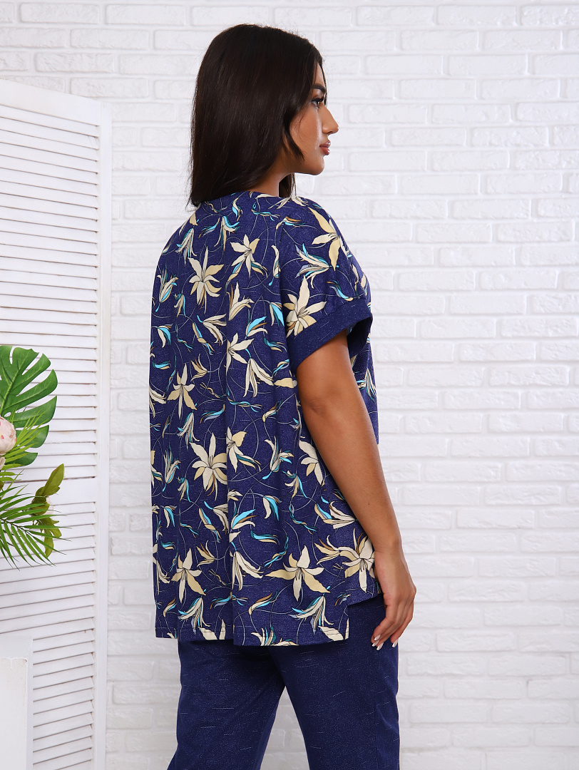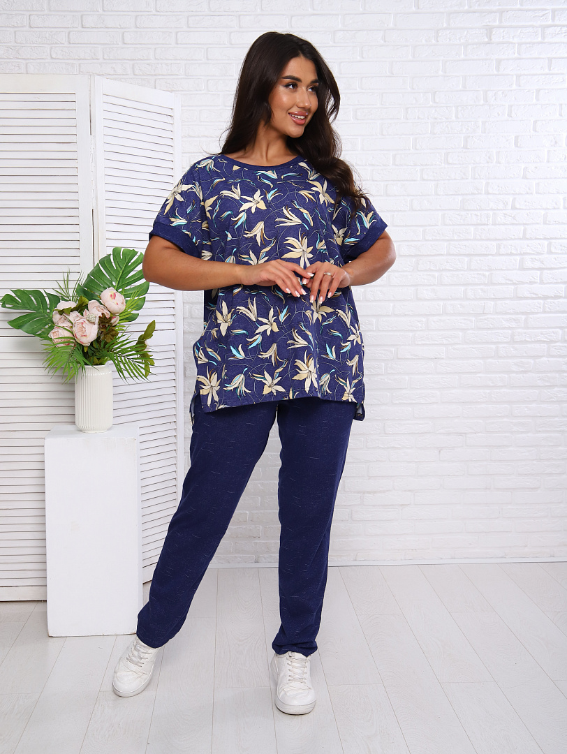 Женский костюм выполнен из трикотажного полотна "кулирка". Костюм состоит из блузы и брюк.