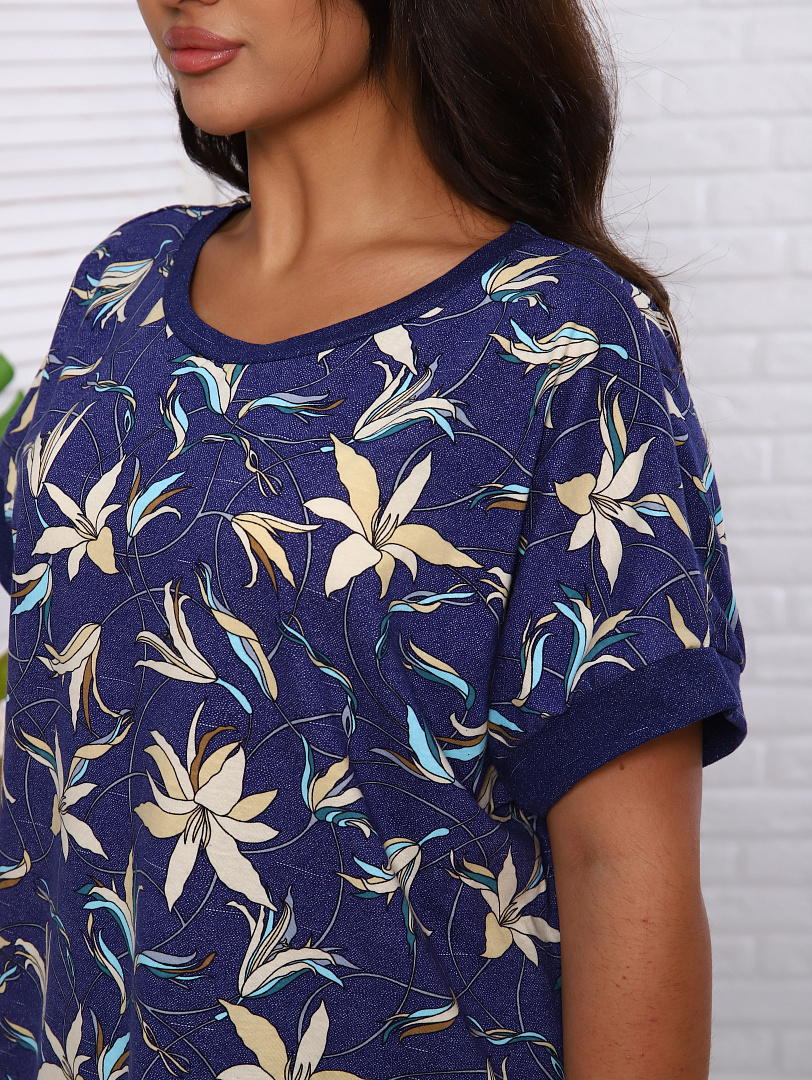 Блуза свободного силуэта, рукав втачной, спущенное плечо.Горловина и отвороты на рукавах отделаны тканью-компаньоном. Брюки свободного силуэта, по бокам карманы.