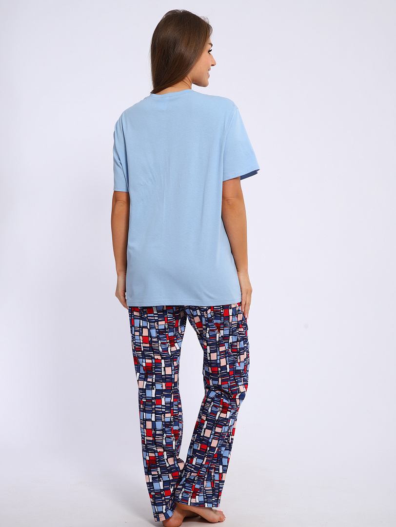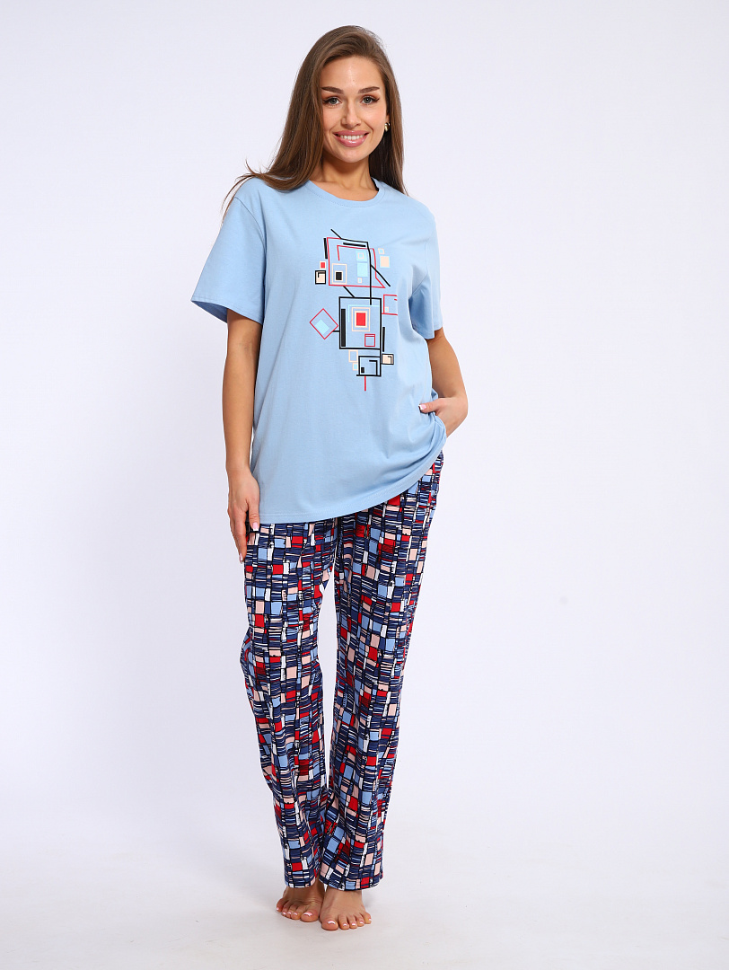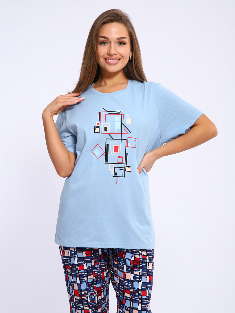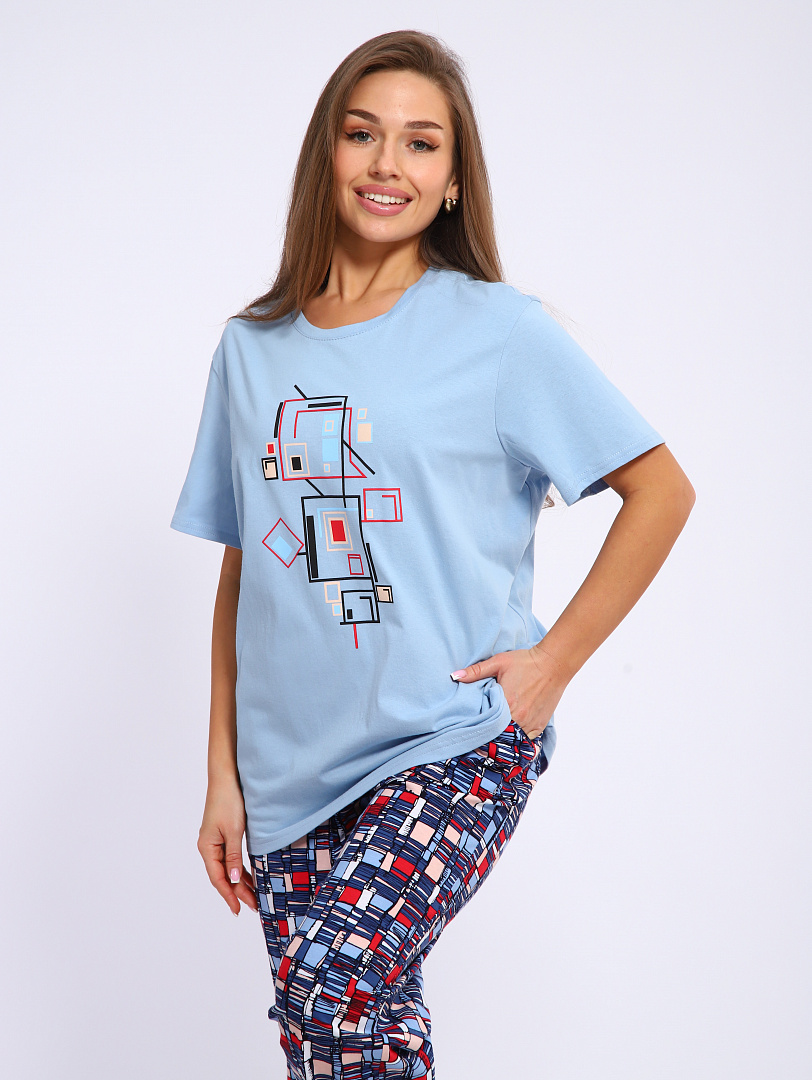 Женский костюм выполнен из трикотажного полотна "кулирка". Костюм состоит из футболки и брюк.